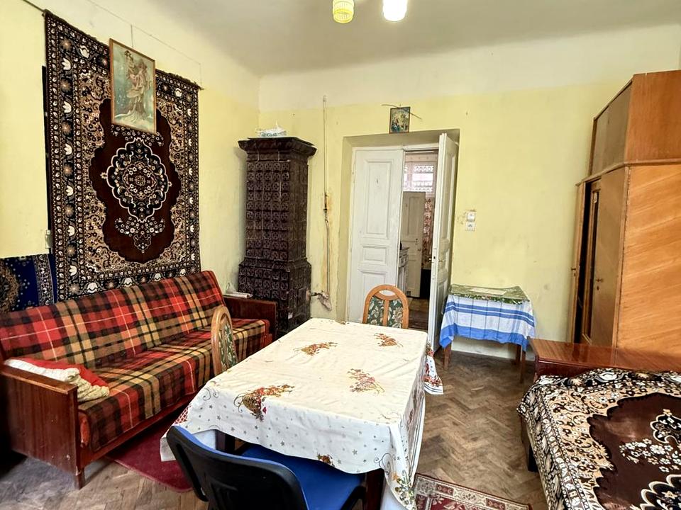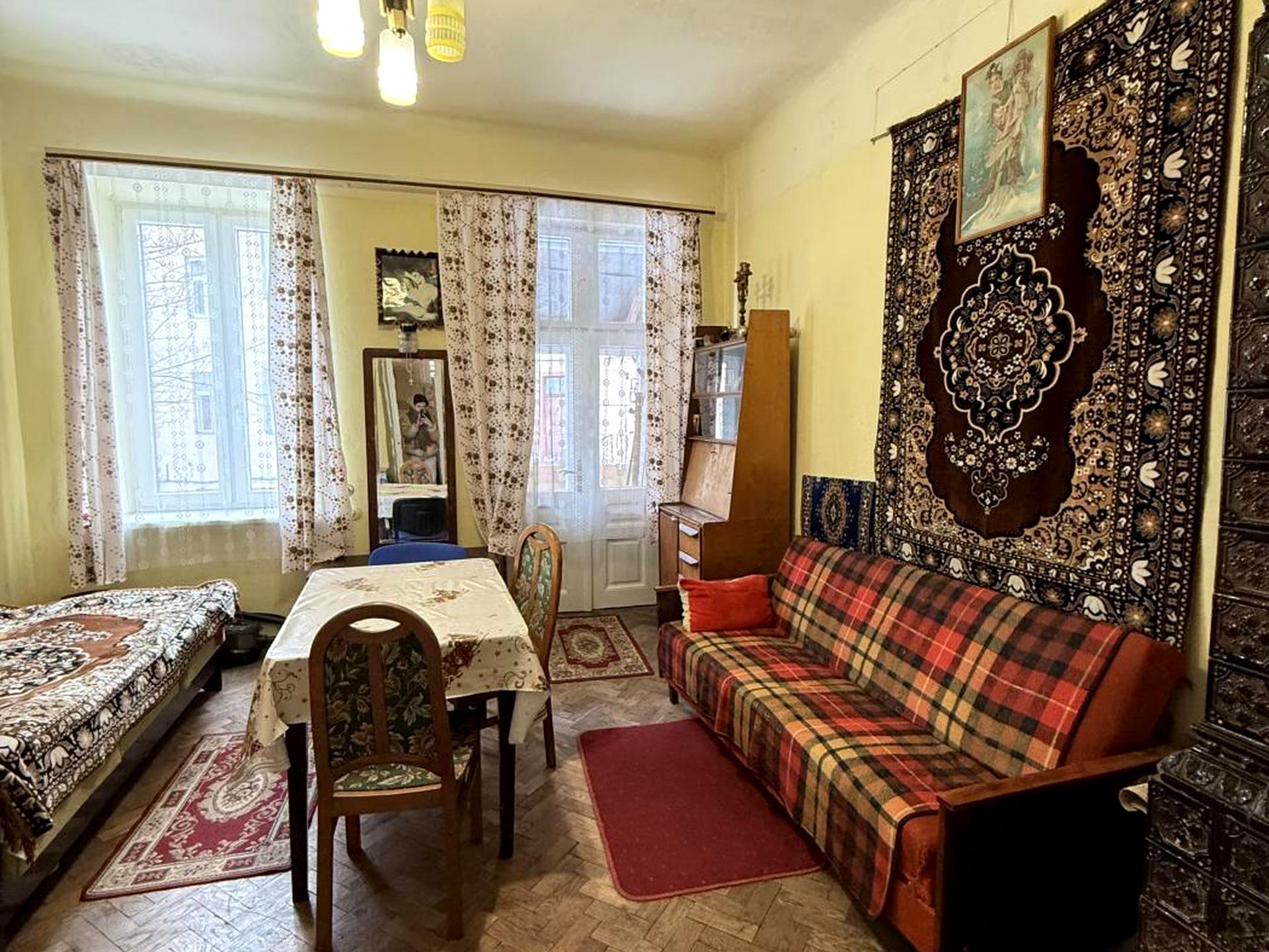 Квартира знаходиться на 2 поверсі, вхід у квартиру по балкону. Опалення у квартирі пічкове, додатково на воду є колонка. Кімната з виходом на балкон відкритий, у кімнаті присутні 2 спальні місця, шафа, стіл та крісла. У квартирі не шумно, вікна виходить у маленький дворик.