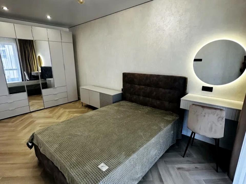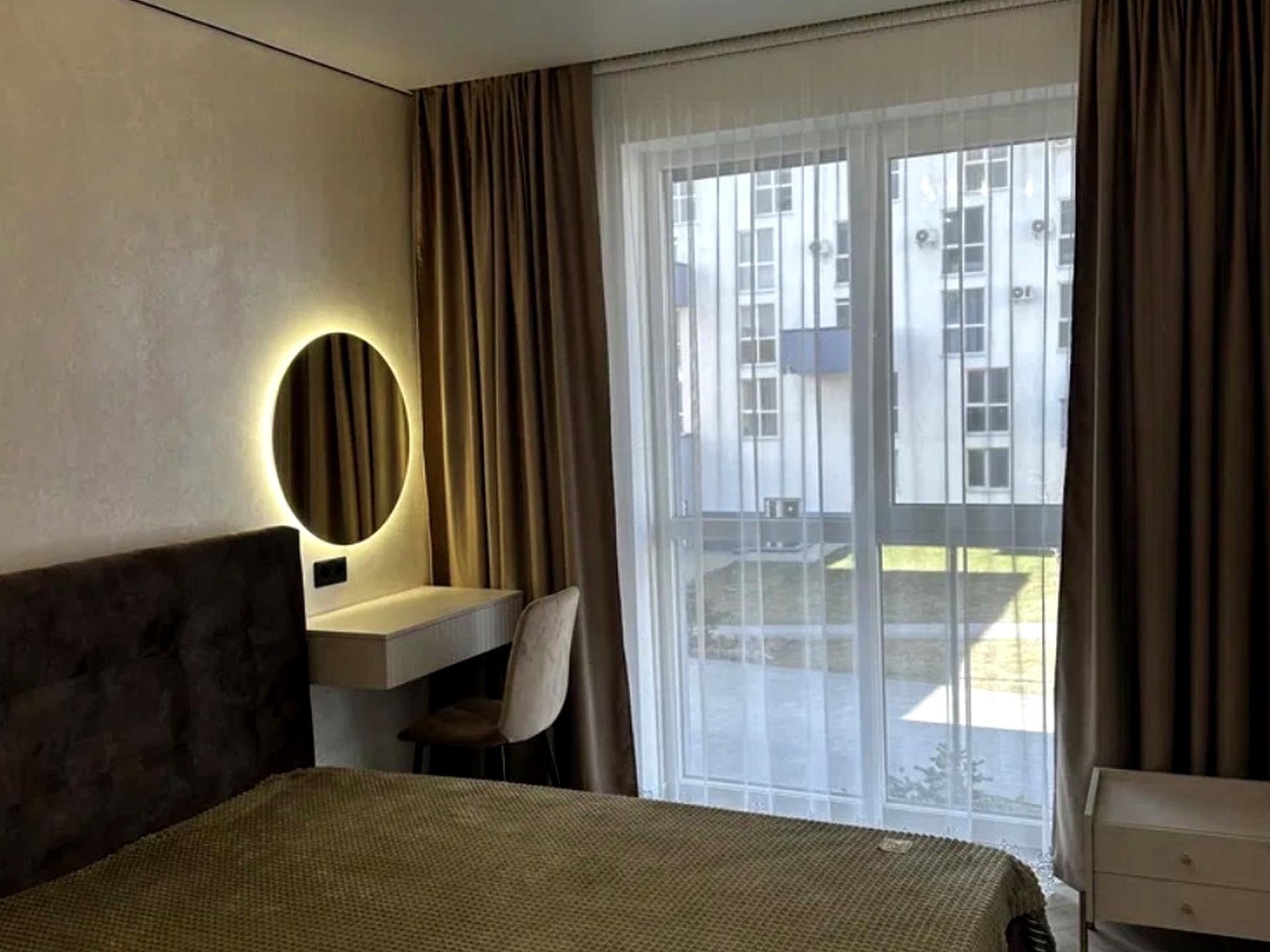 У спальні — двоспальне ліжко з ортопедичним матрацом, велика шафа та місце під робочу або мейкап-зону. На кухні є додаткове спальне місце.