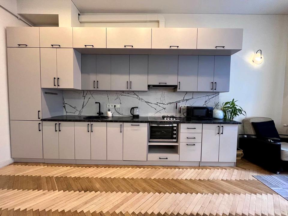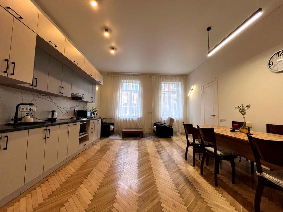В квартирі 2 кімнати, висота стелі 3.4 метра, Технологія будівництва - Цегляна, Тип будинку - Дореволюційний. Є газ, кухоння плита комбінована. Немає балкона. У квартирі є Телевізор, Підігрів підлоги, Пральна машина, Душова кабіна, Холодильник, Мікрохвильовка, Посудомийна машина, Посуд. Будинок побудований в 1910 році. Загальний стан квартири - З ремонтом. Гаряча вода - газовий котел. Кількість санвузлів: 1. Інтернет оптоволоконний. Працює без світла - вода, газ, інтернет. Тип кухні - кухня-студія. Кількість спален: 2. Комісія за послуги 100 %