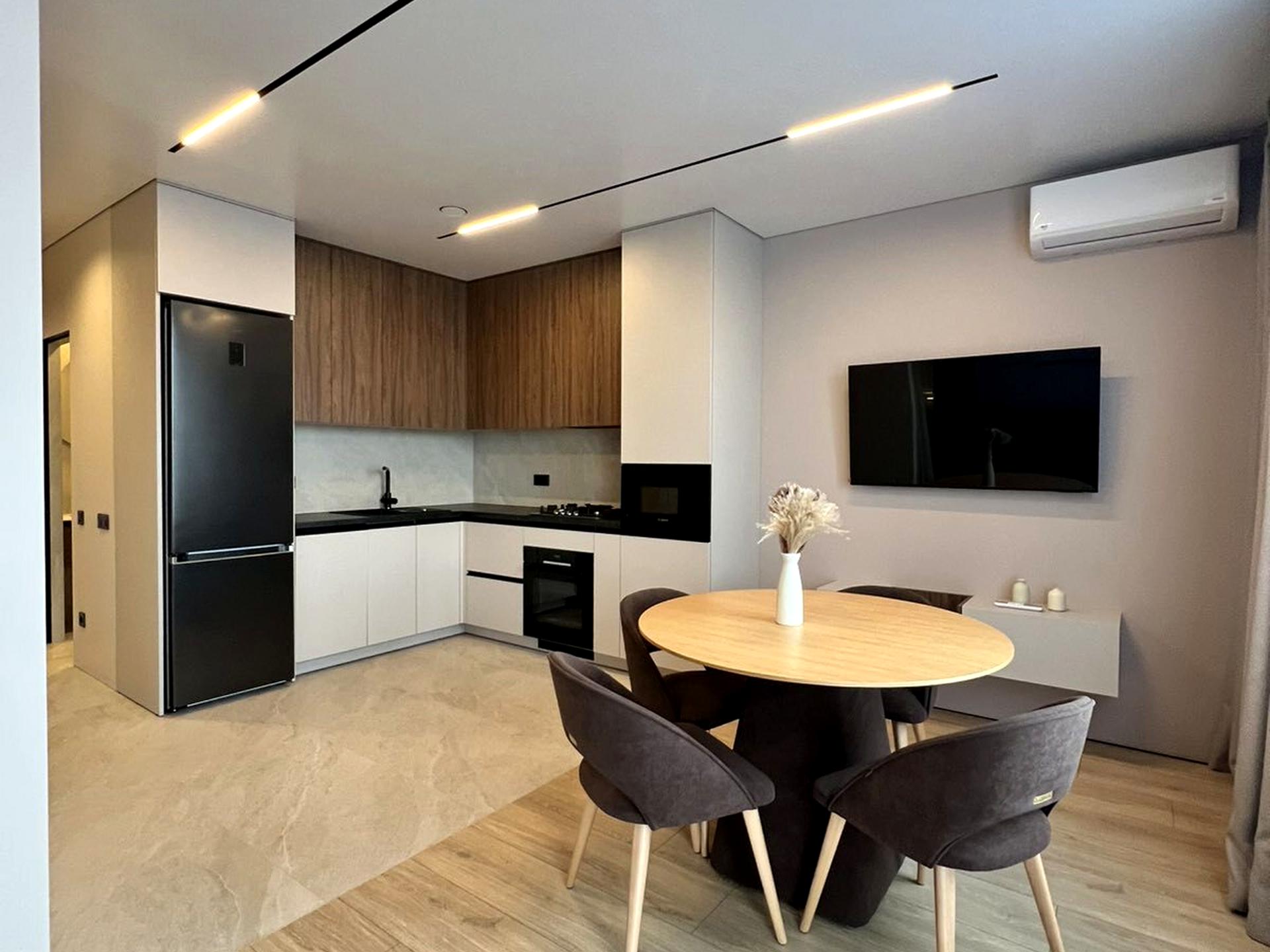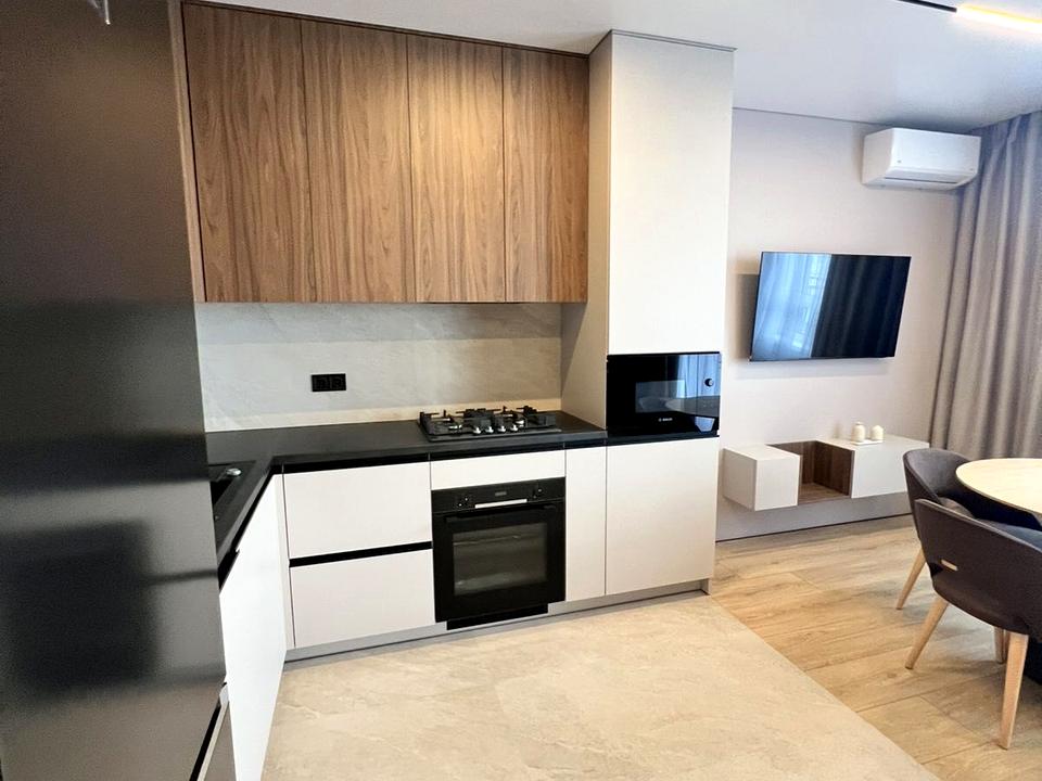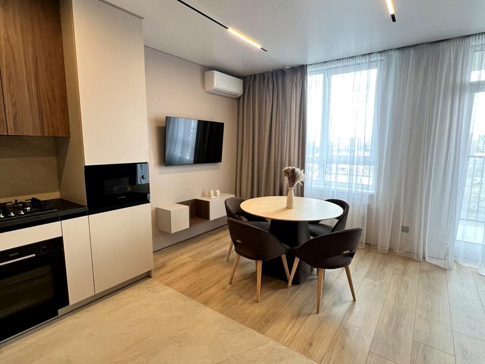 В квартирі 1 кімната, Тип будинку - Спец. проект. Є газ, кухонна плита газова. Є балкон. У квартирі є Телевізор, Кабельне ТБ, Підігрів підлоги, Кондиціонер, Пральна машина, Душова кабіна, Холодильник, Мікрохвильовка, Посудомийна машина. Будинок побудований в 2025 році. Загальний стан квартири - З ремонтом. Гаряча вода - газовий котел. Кількість санвузлів: 1. Інтернет дротовий (кабельний). Працює без світла - вода, газ, інтернет. Тип кухні - кухня-студія. Кількість спален: 1. Комісія за послуги 100 $