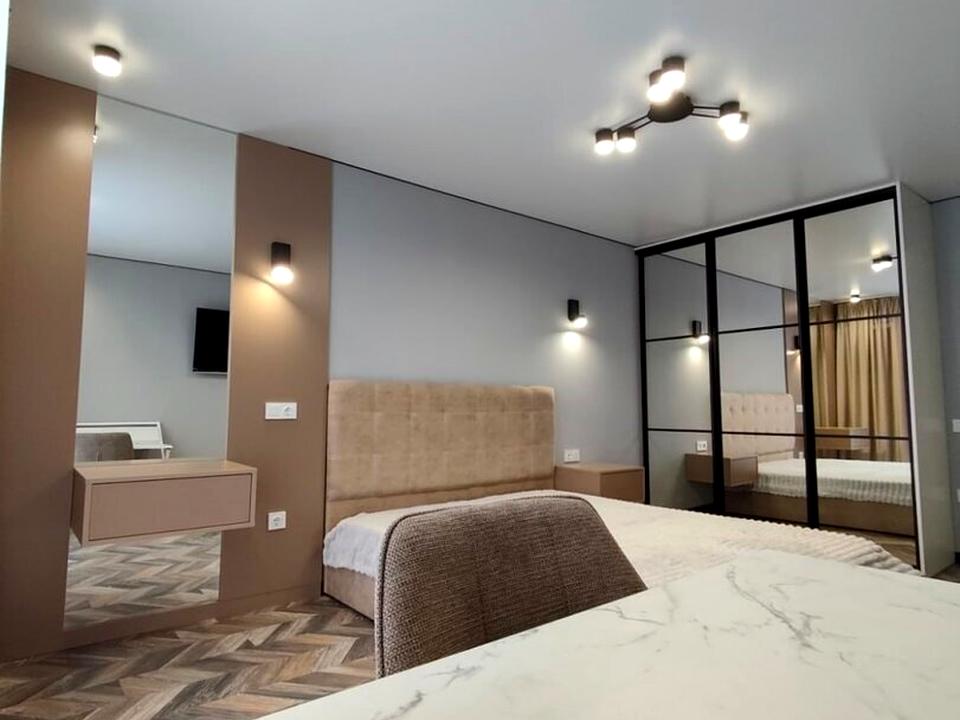 Дві великі шафи-купе, двоспальне ліжко, великий диван.