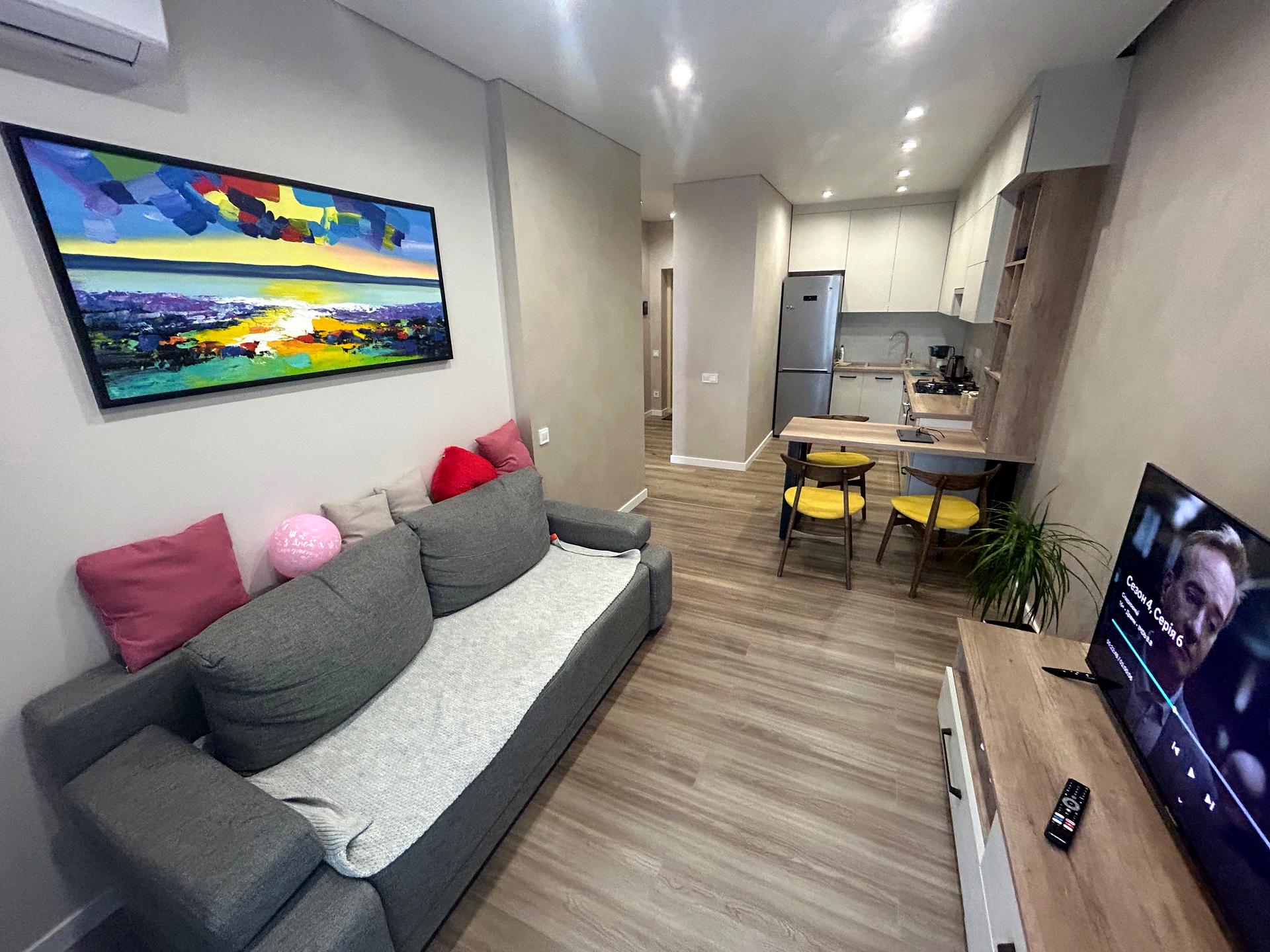 В квартирі 1 кімната, Технологія будівництва - Цегляна. Планування кімнат Роздільне. Є газ. У квартирі є Телевізор, Кондиціонер, Пральна машина, Душова кабіна, Холодильник, Посудомийна машина. Загальний стан квартири - З ремонтом. Гаряча вода - газовий котел. Інтернет оптоволоконний. Комісія за послуги 100 %