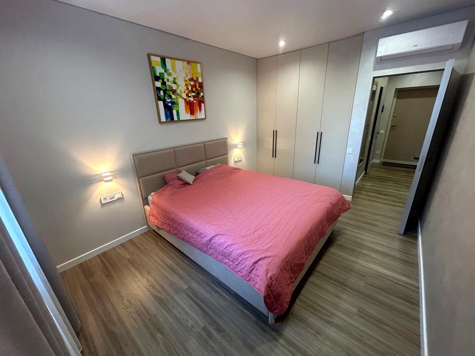 Простора квартира з сучасним плануваням: велика кухня 18 м2 з диваном та ізольована спальня з двоспальним ліжком та шафою.