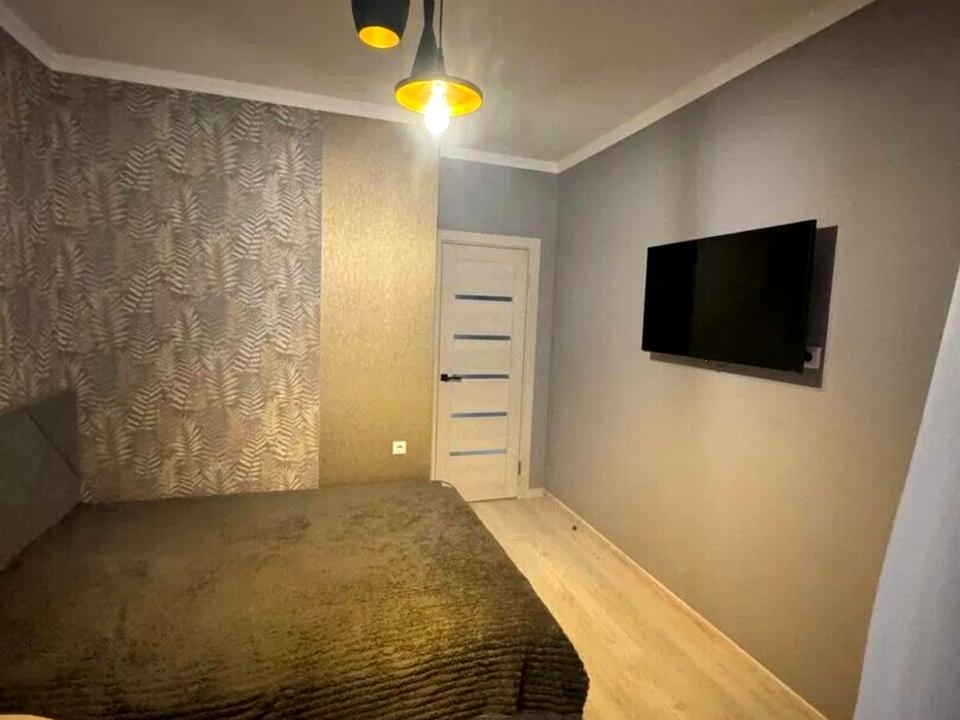 Ізольована кімната з двоспальним ліжком, простора кухня та велика лоджія з панорамними вікнами. Додатково — розкладні дивани, що робить простір максимально функціональним.