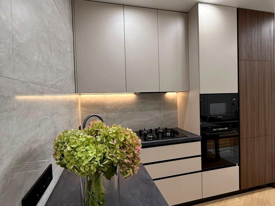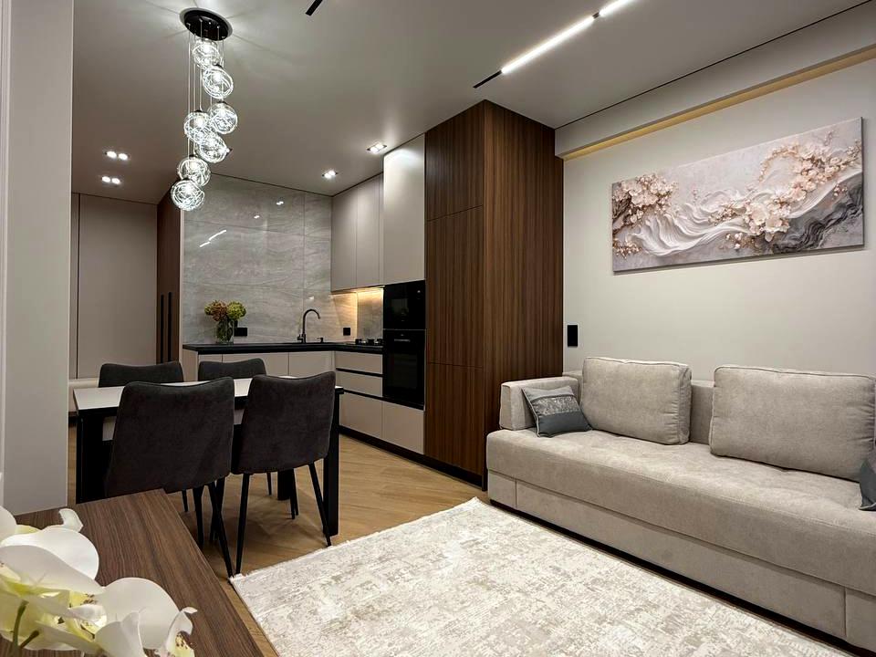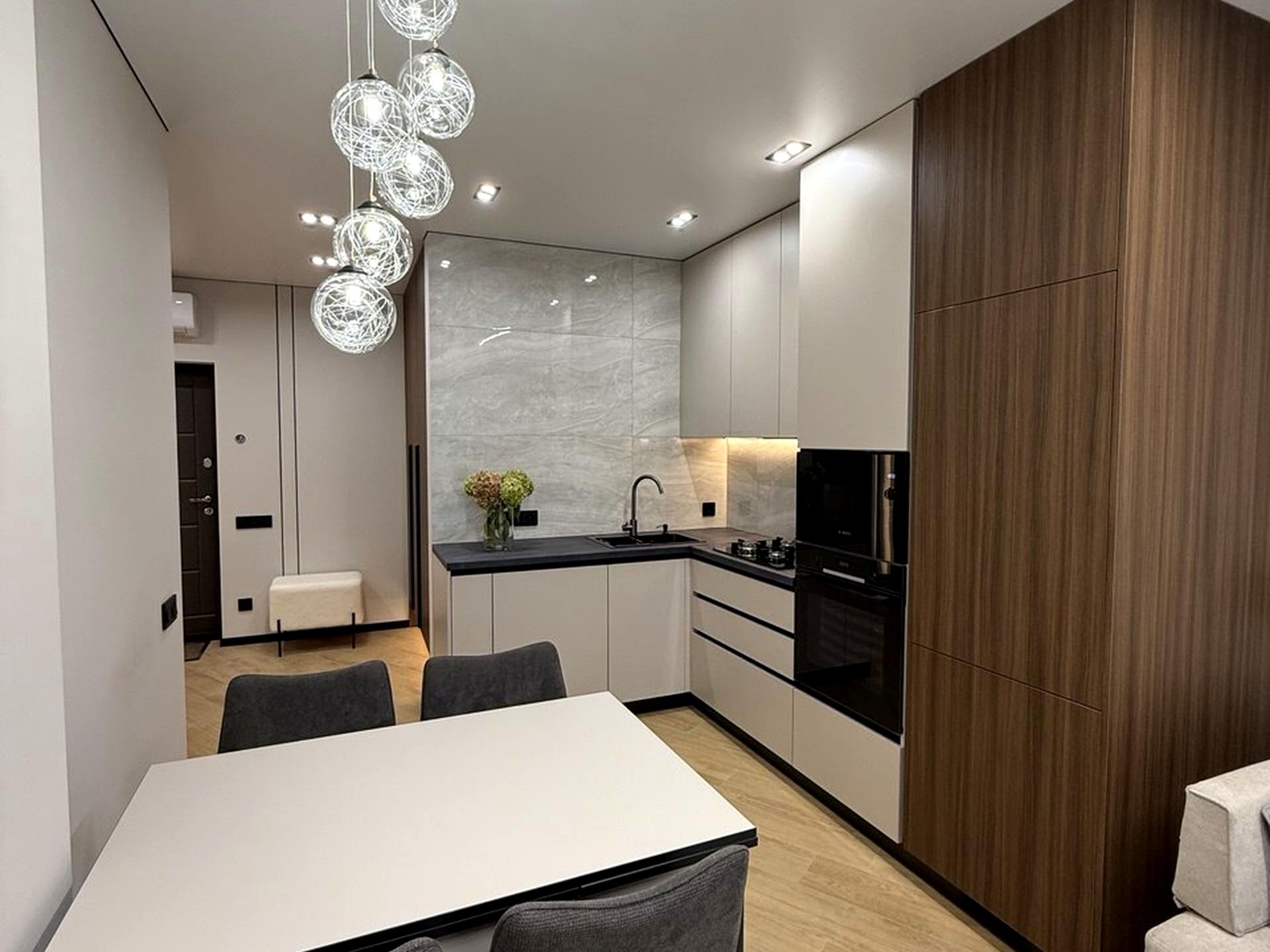 В квартирі зроблено сучасний дизайнерський ремонт, багато елементів освітлення та декору: