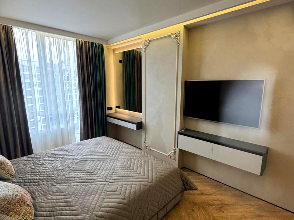 Особливості даної квартири — сучасний дизайн, дизайнерські меблі (AGT, EGEER), штучний камінь в оздобленні, великі панорамні вікна з краєвидом на місто, квартира повністю готова до заселення. У будинку — підземний паркінг, дизайнерський ремонт під’їздів і коридорів загального користування, є консьєрж, бомбосховище.
