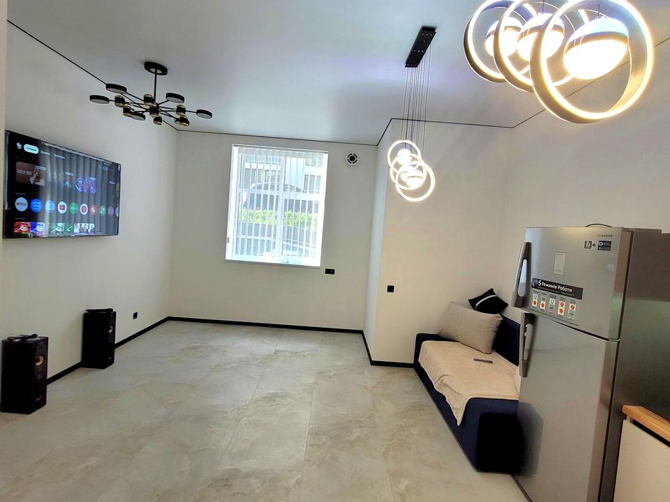 Високі стелі- 3.30,а квартирі є2 коридори,простора кухня-студія 27 кв²,великий розкладний стіл,спальня,санвузол-все з якісних матеріалів
