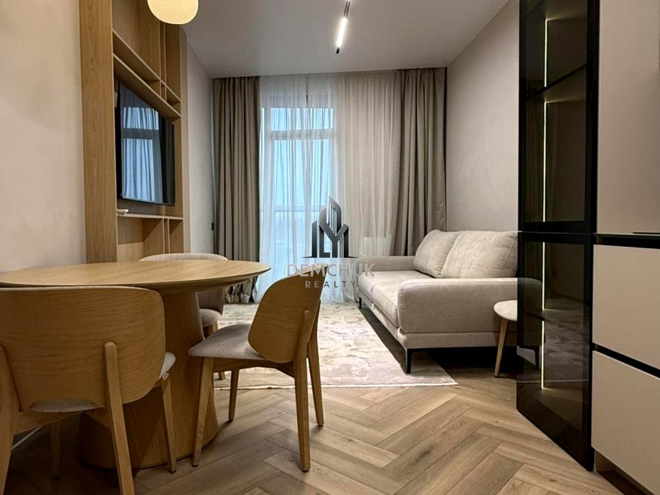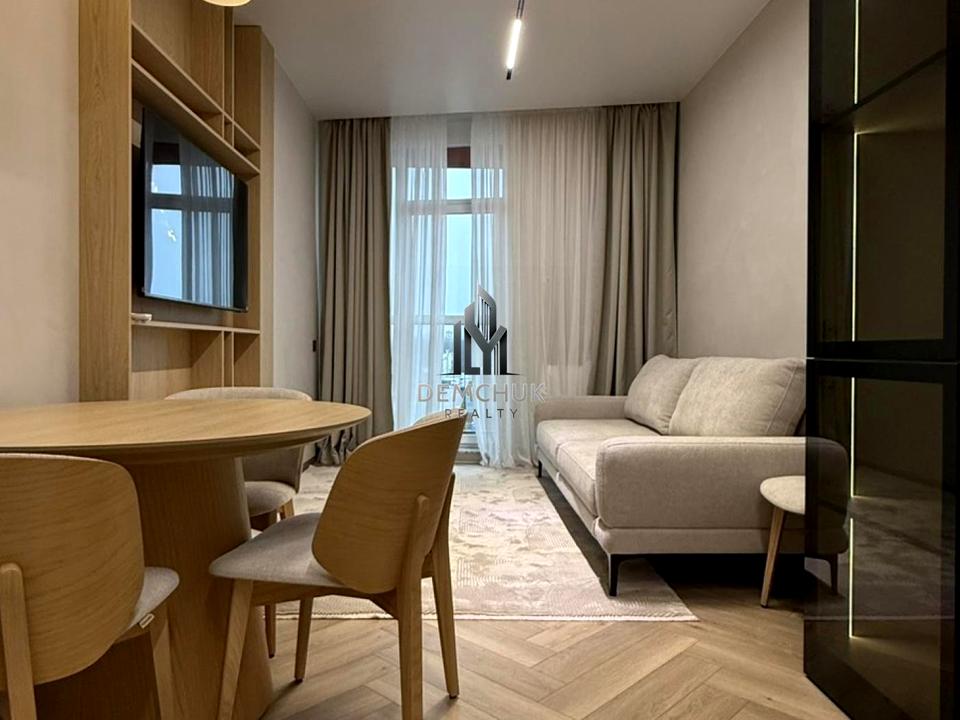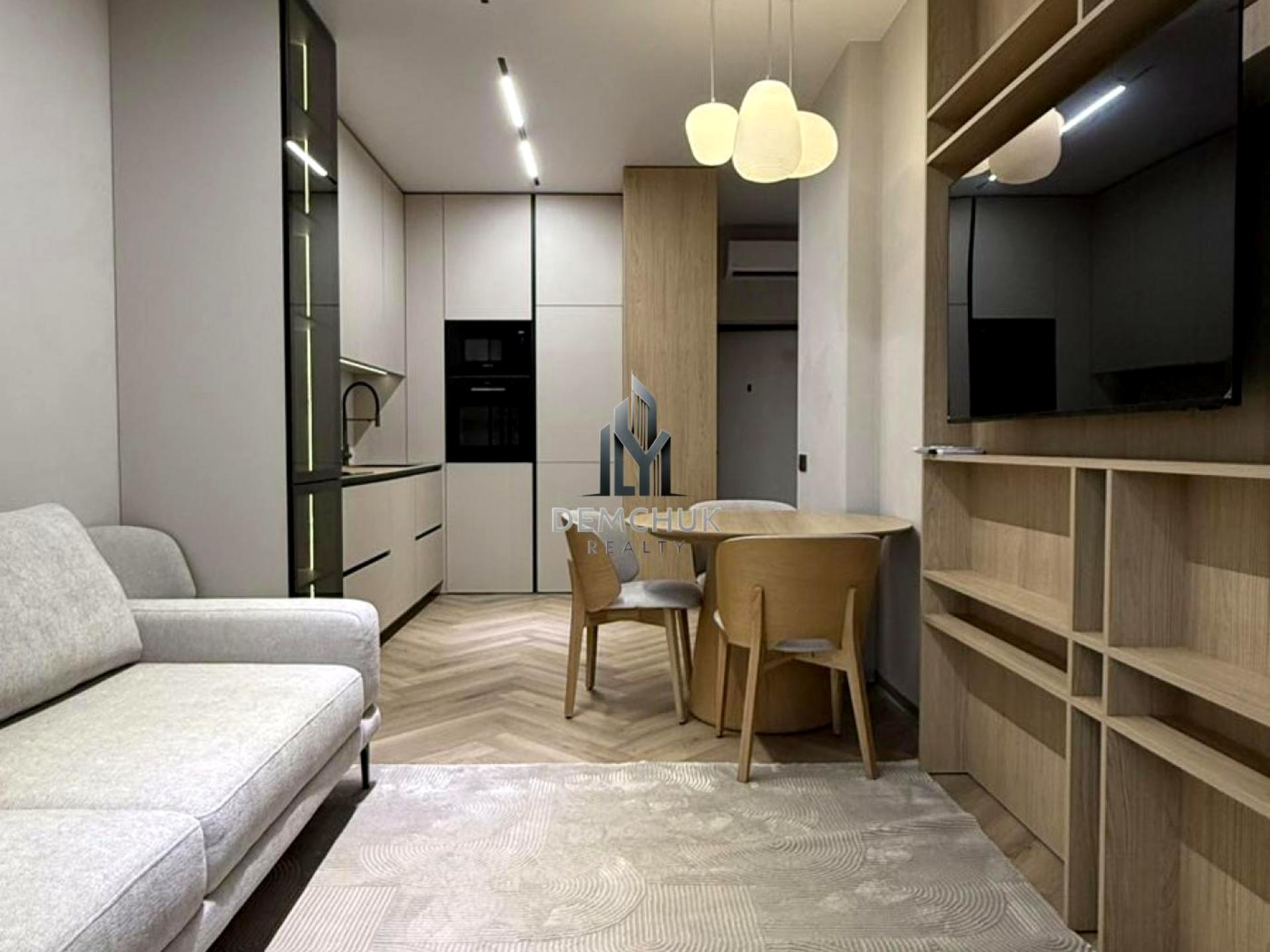 Простора кухня-студія з розкладним диваном, телевізором Smart TV та великою кількістю сценаріїв освітлення. Підігрів підлоги в зоні кухні та санвузла.