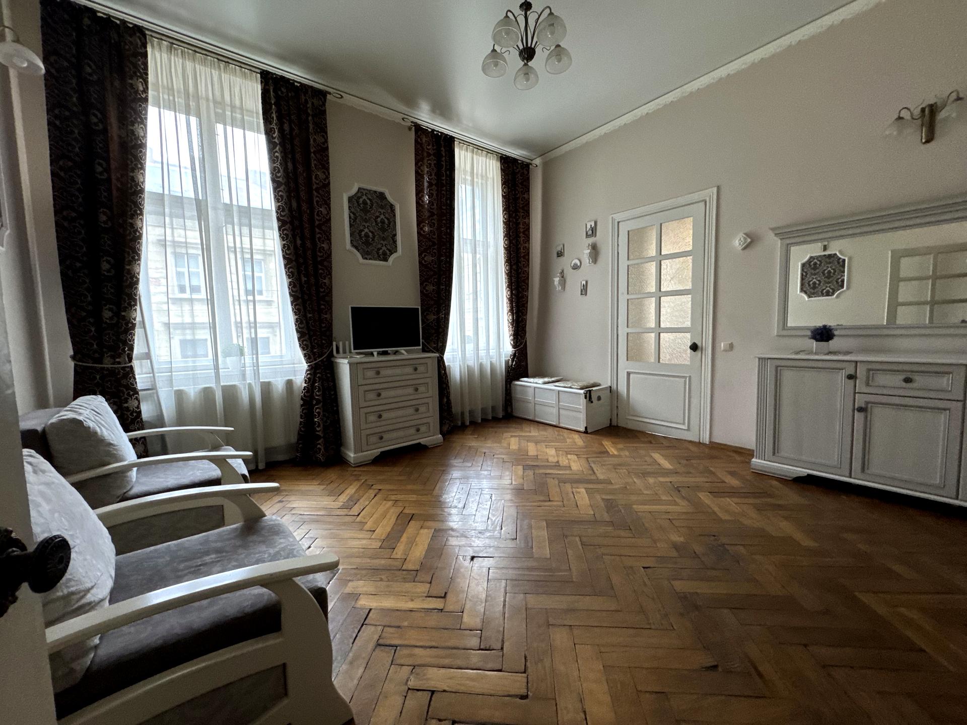 В квартирі збережено елементи автентики: старовинні піски, паркет, вікна, стилізовано під тогочасну епоху