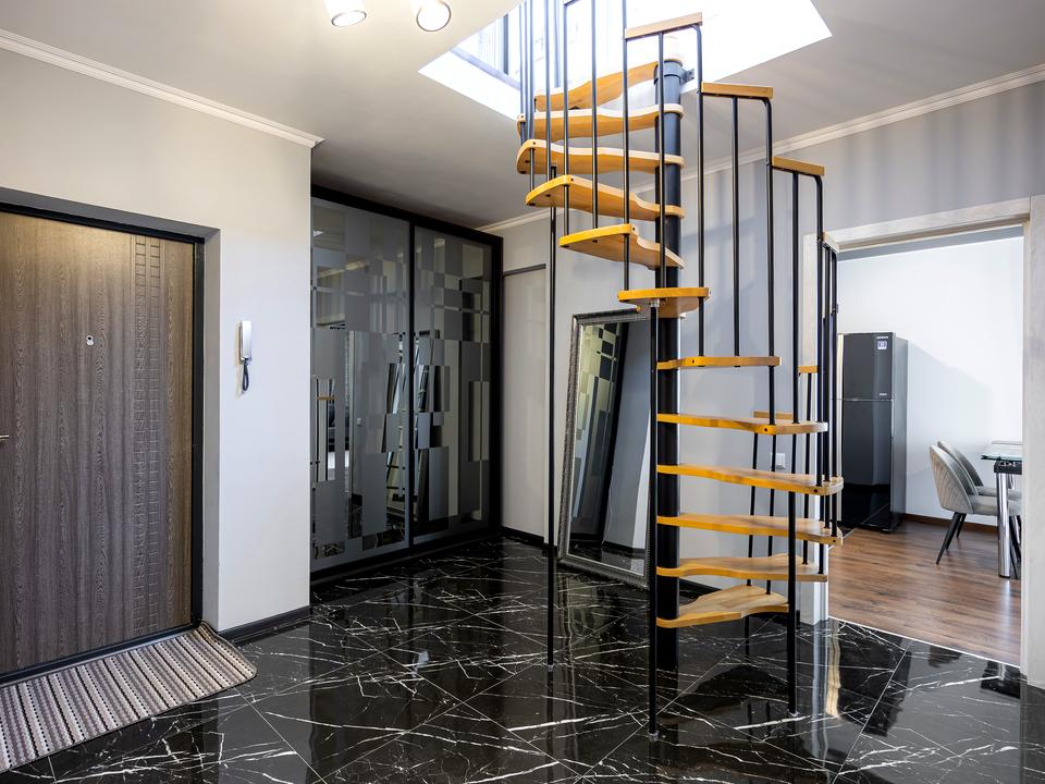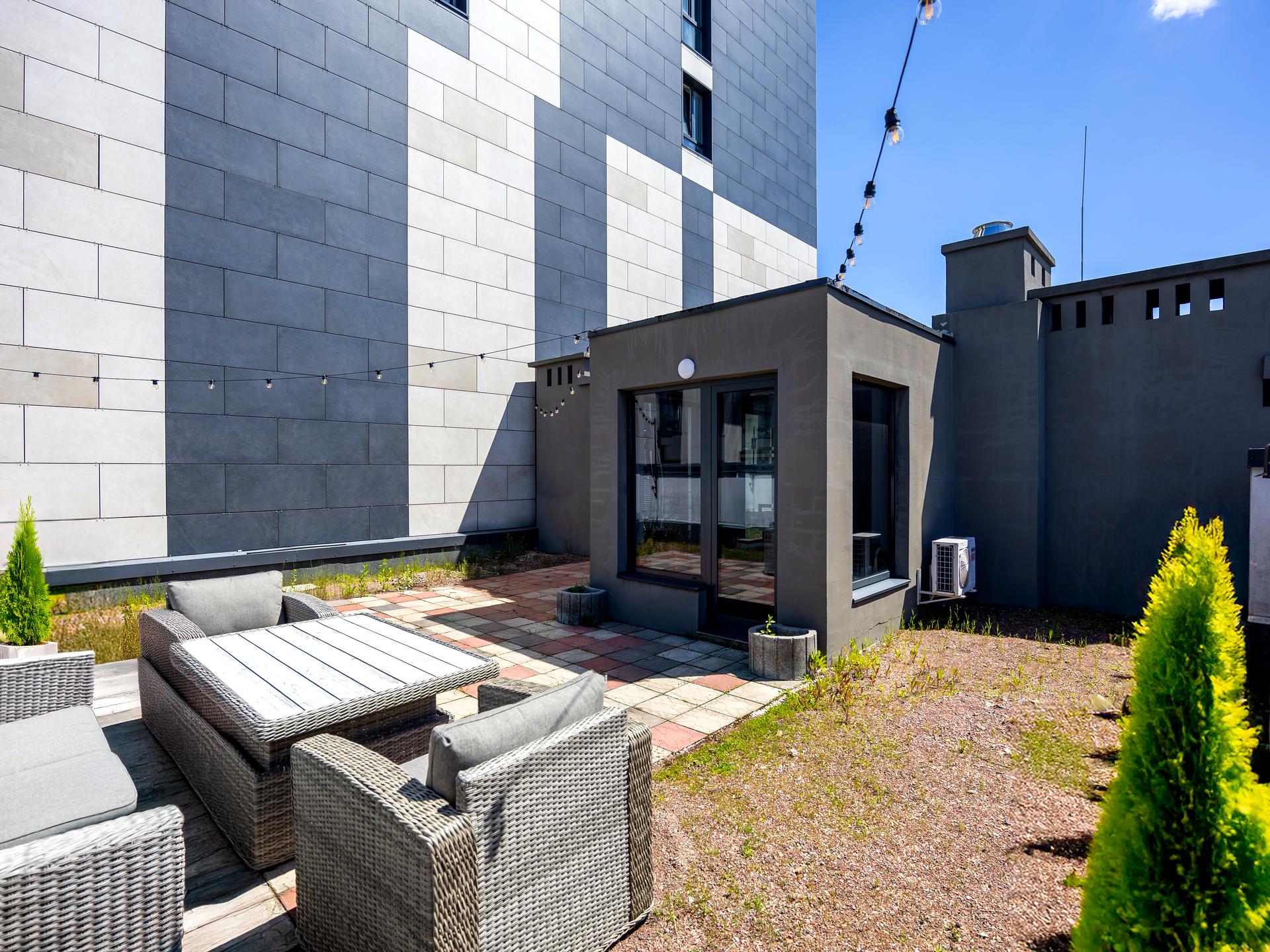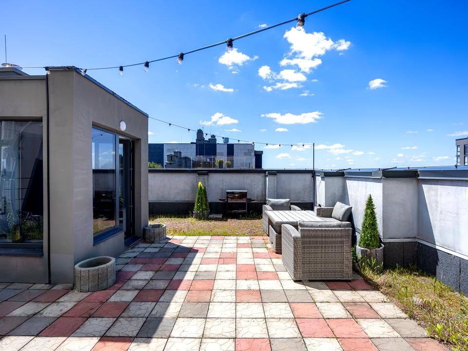 Планування: дві окремі кімнати, лоджія + кухня-студія, роздільні санвузли. Тераса на даху.