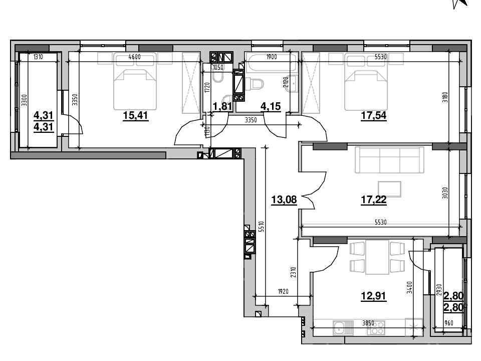 Кількість кімнат — трикімнатна квартира.