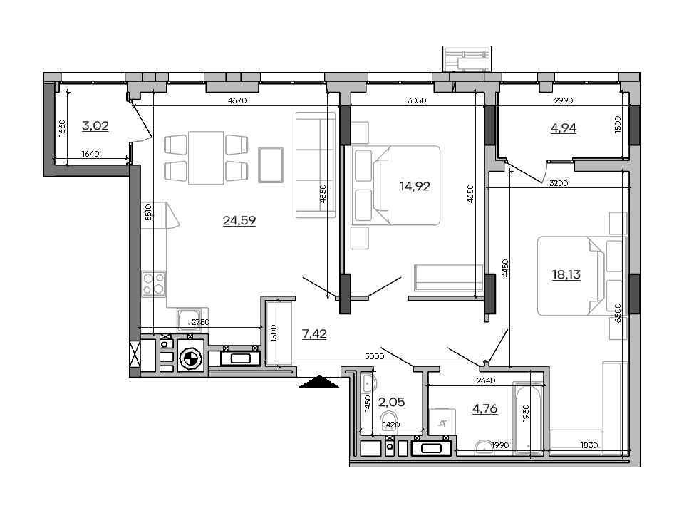 Загальна площа — 79.83 м², житлова — 33.05 м², кухня — 24.59 м².