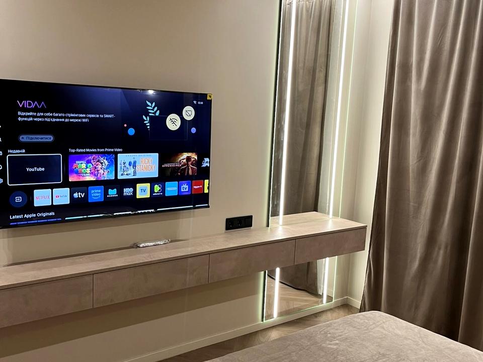 Квартира повністю укомплектована якісними меблями та технікою провідних брендів (Bosch, Whirlpool, Franke, Hisense та ін.). Встановлено підігрів підлоги, панорамні вікна. Є тераса.