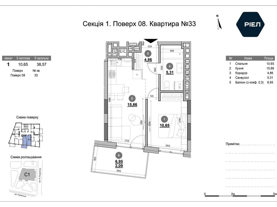 Загальна площа — 38.57 м², житлова — 10.65 м², кухня — 15.66 м².