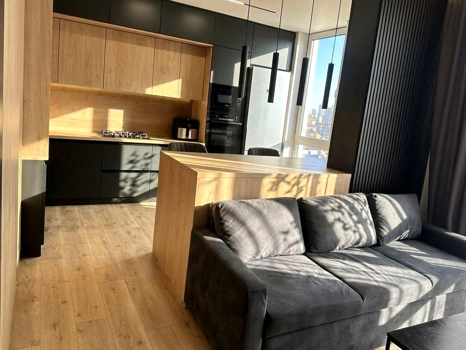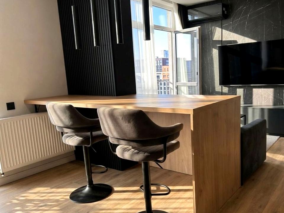 В квартирі 1 кімната, Технологія будівництва - Монолітно-каркасна, Тип будинку - Спец. проект. Є газ, кухонна плита газова. Є балкон. У квартирі є Телевізор, Підігрів підлоги, Кондиціонер, Пральна машина, Сушильна машина, Душова кабіна, Ванна, Холодильник, Мікрохвильовка, Посудомийна машина, Сигналізація. Будинок побудований в 2021 році. Загальний стан квартири - З ремонтом. Гаряча вода - газовий котел. Кількість санвузлів: 1. Інтернет оптоволоконний. Працює без світла - вода, газ, опалення, інтернет. Тип кухні - кухня-студія. Кількість спален: 1. Є підземний паркінг, доступний як укриття. Інфраструктура території: дитячий майданчик, спортивний майданчик. Комісія за послуги 5 %