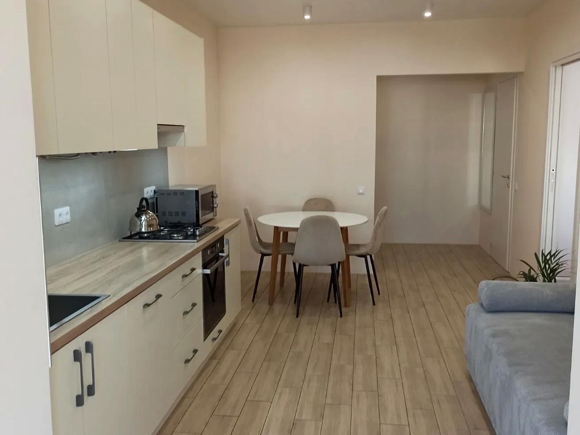 В квартирі 1 кімната. Є газ, кухонна плита газова. У квартирі є Телевізор, Підігрів підлоги, Пральна машина, Сушильна машина, Ванна, Холодильник, Посудомийна машина. Загальний стан квартири - З ремонтом. Гаряча вода - газовий котел. Кількість санвузлів: 1. Інтернет оптоволоконний. Працює без світла - вода, газ, інтернет. Тип кухні - окрема кухня. Кількість спален: 1. Інфраструктура території: дитячий майданчик, виокремлена зона для вигулу тварин, двір без авто. Комісія за послуги 5 %