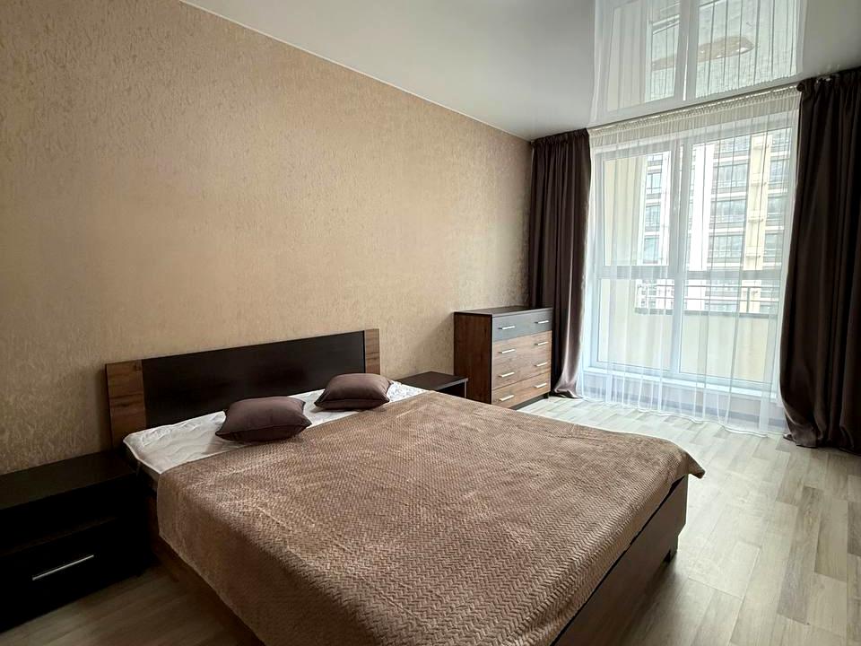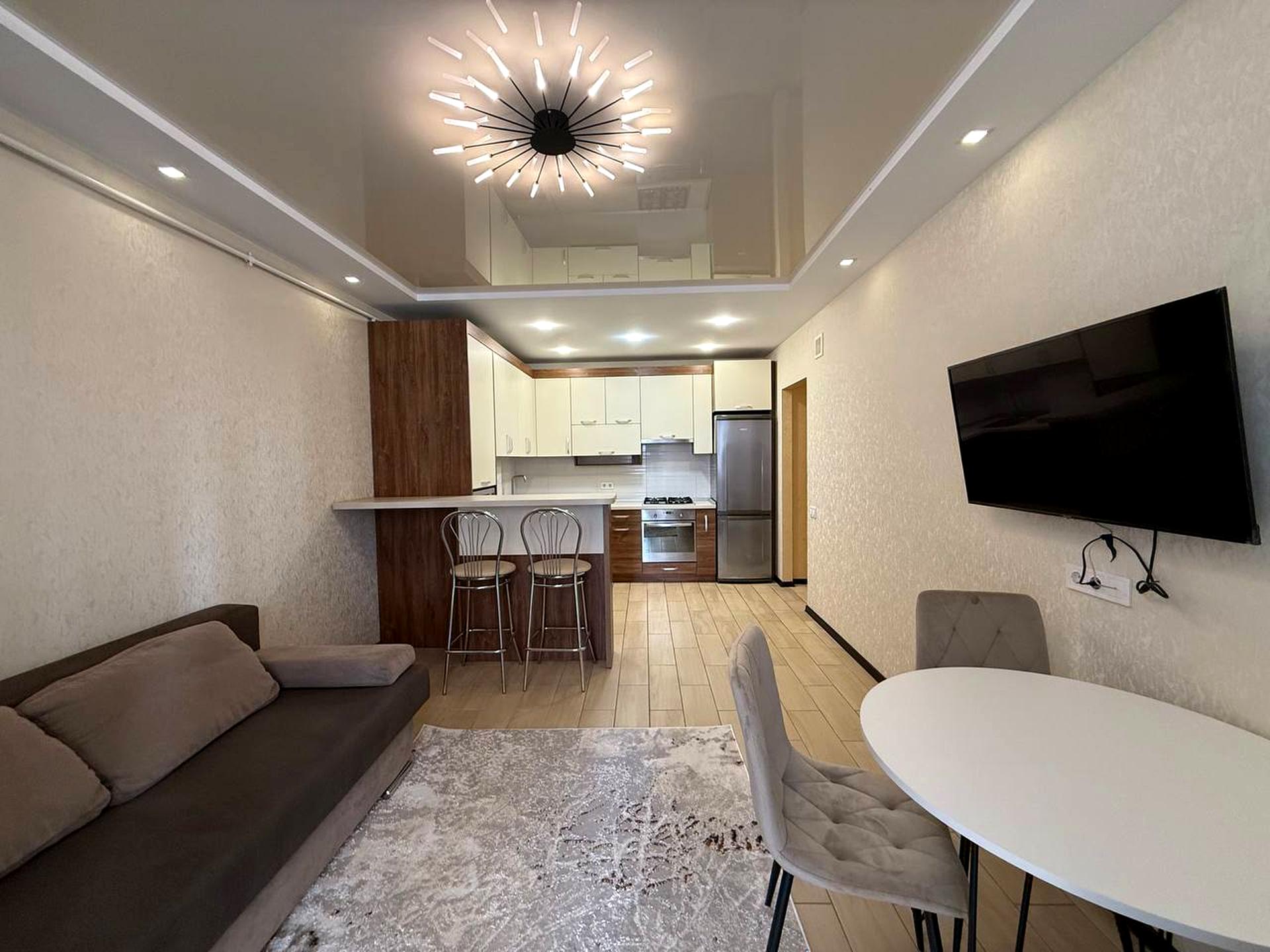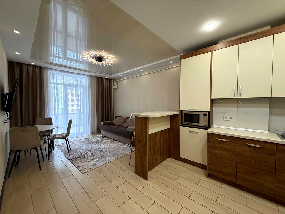 В квартирі 2 кімнати, висота стелі 2.7 метра, Технологія будівництва - Блочна, Тип будинку - Спец. проект. Є газ, кухонна плита газова. Є балкон. У квартирі є Телевізор, Підігрів підлоги, Кондиціонер, Пральна машина, Душова кабіна, Холодильник, Мікрохвильовка, Посудомийна машина. Будинок побудований в 2023 році. Загальний стан квартири - З ремонтом. Гаряча вода - газовий котел. Кількість санвузлів: 1. Інтернет оптоволоконний. Працює без світла - газ, інтернет. Тип кухні - кухня-студія. Кількість спален: 2. Комісія за послуги 5 %