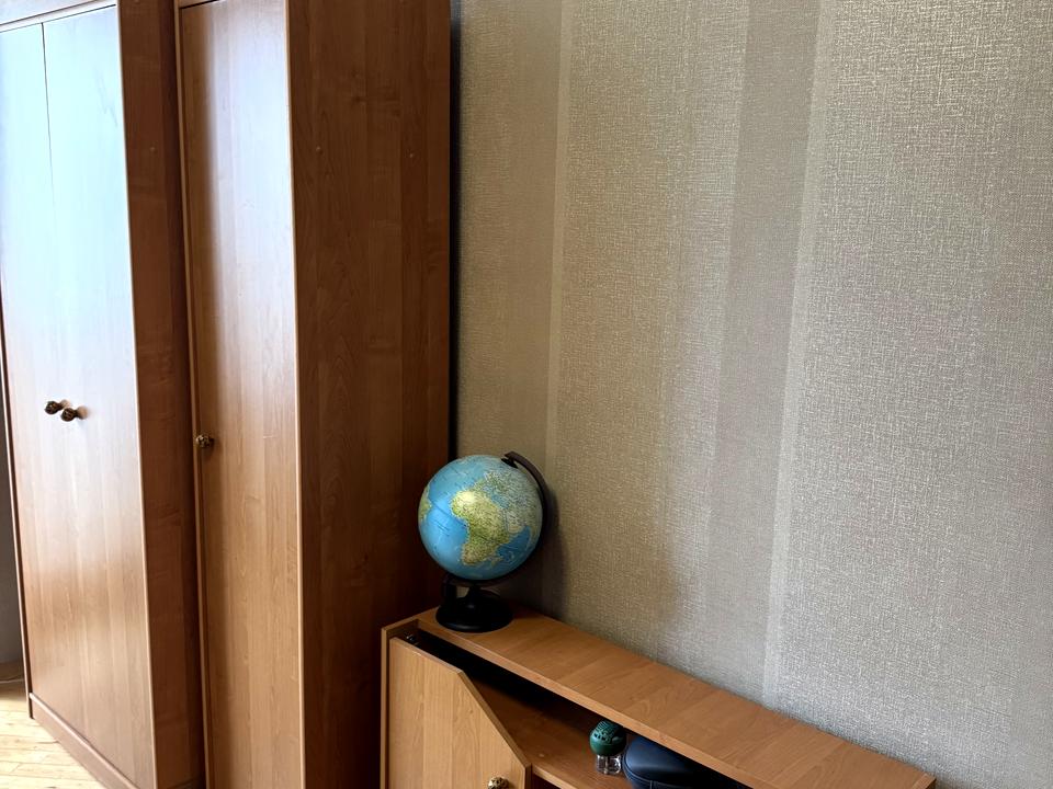 В кімнаті односпальне ліжко, шафа для зберігання речей, стіл, що зручно для студентів.