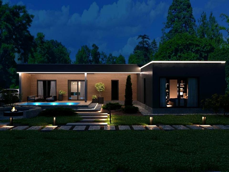 Формат дома: 3 спальни, 3 сан/узла, кухня-гостиная, и несколько выходов из дома на террасу с бассейном.
