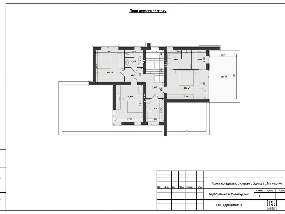Другий поверх: три спальні кімнати, гардеробна, коридор, два санвузли, пральня, відкрита тераса.