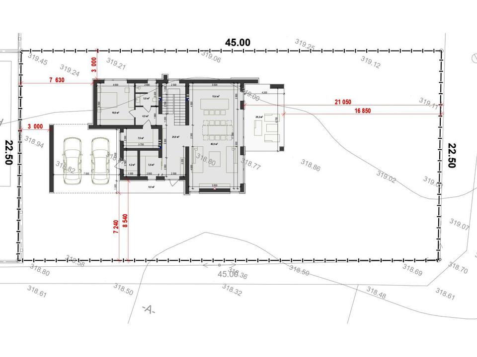 Загальна площа будинку - 233 м2, житлова - 78 м2, кухня-вітальня - 62 м2. Дві тераси площею 29 м2 та 24 м2.