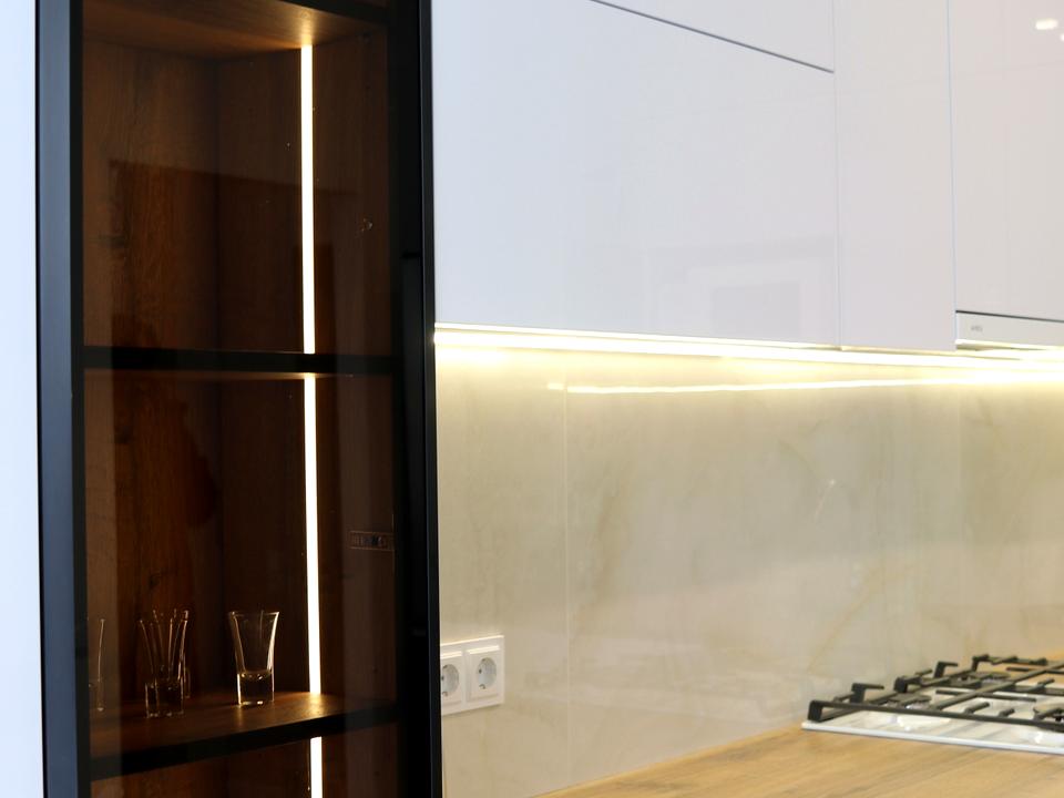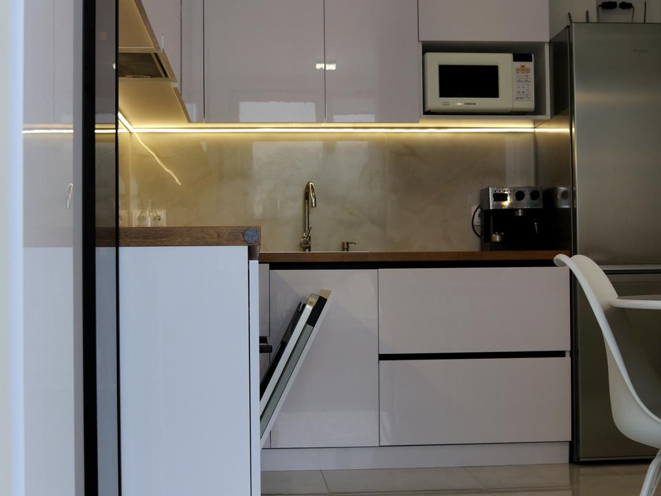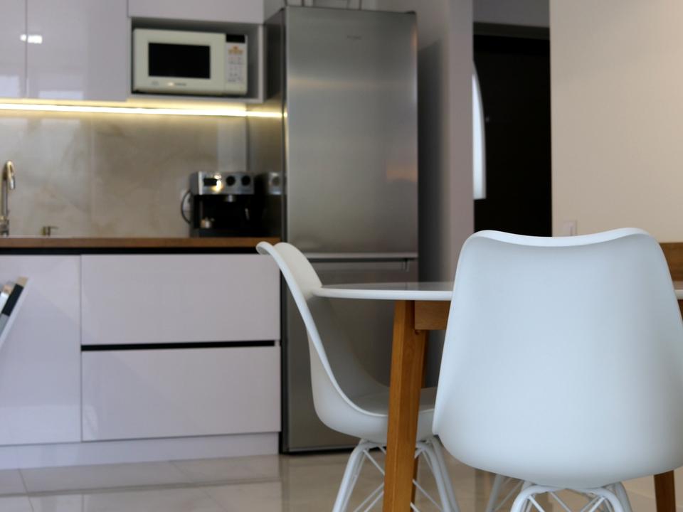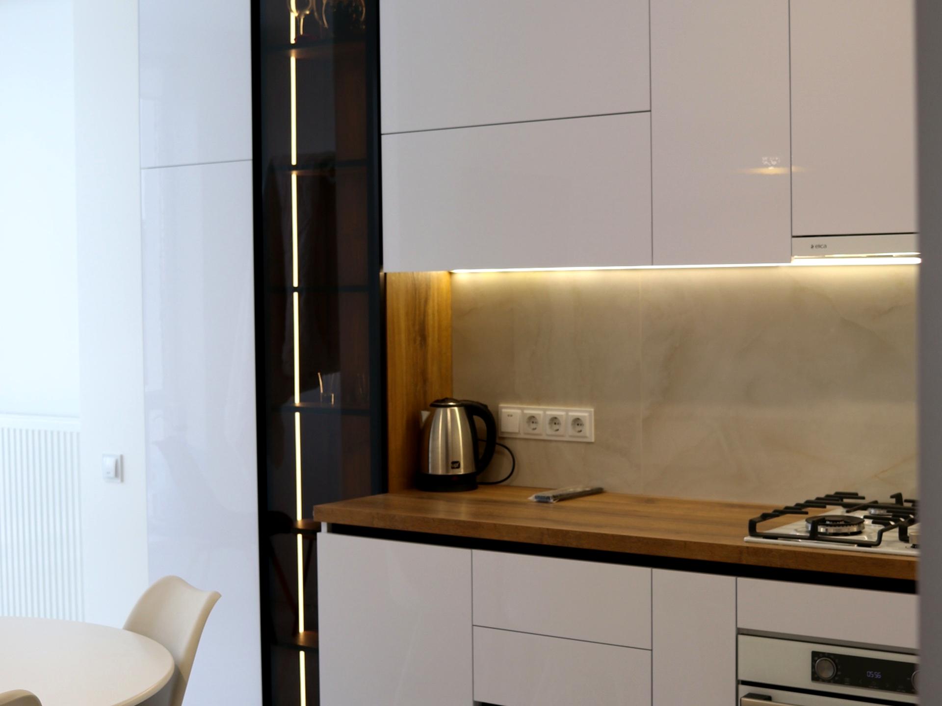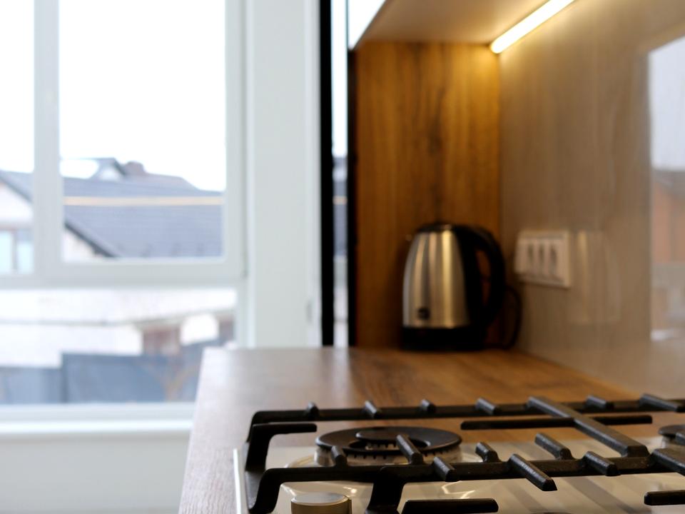 Кухня обладнана газовим котлом (індивідуальне опалення), газовою плитою, холодильником, посудомийною машиною 60 см, мікрохвильовою піччю, кавоваркою, електрочайником і телевізором. Є підігрів підлоги та балкон із підігрівом підлоги.