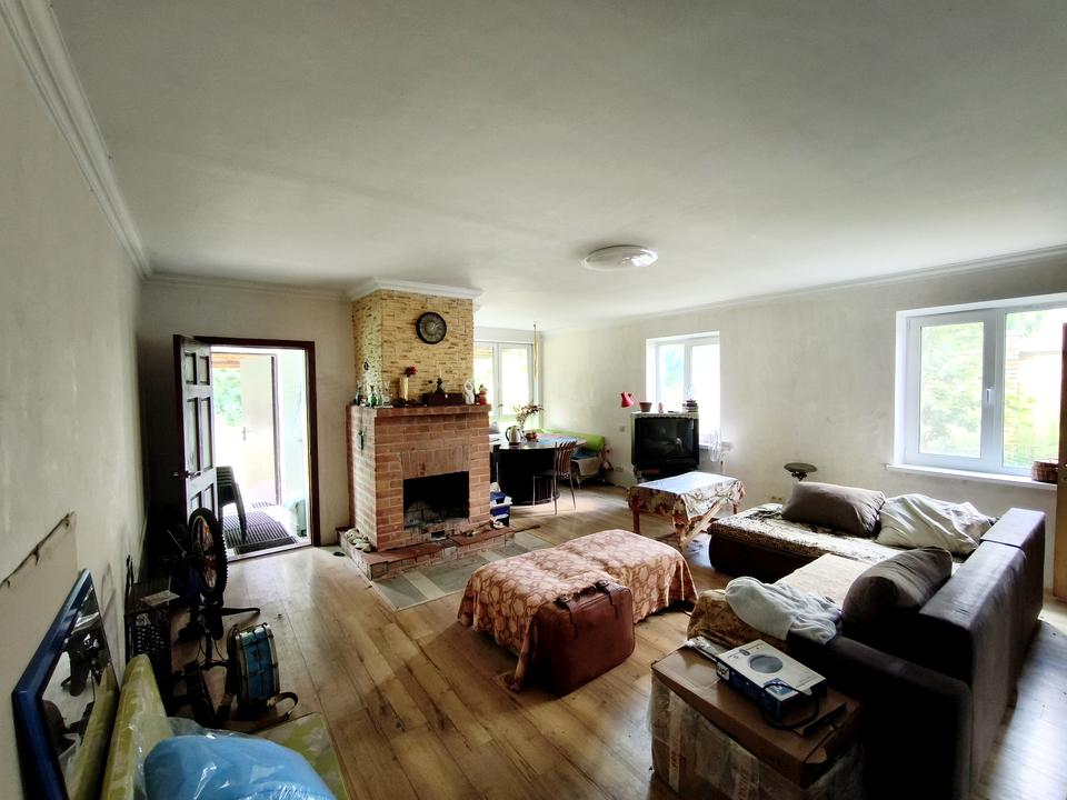 - простора кухня вітальня на першому поверсі з каміном.