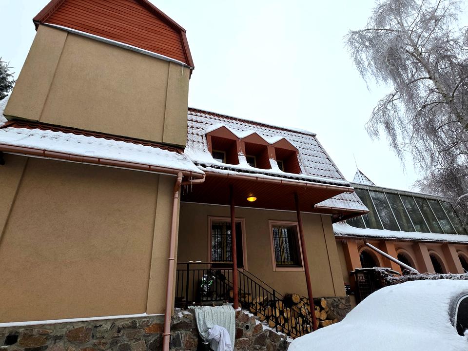 Будинок розташований у затишній зеленій зоні на березі власного озера. Територія доглянута, з великими дорослими деревами, чистим повітрям та чудовими панорамними видами.