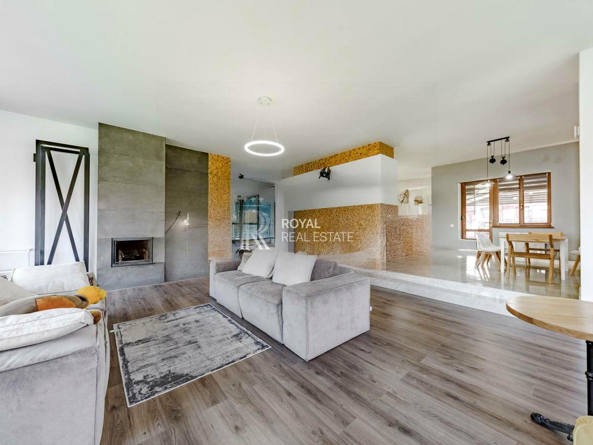 Простора вітальня з каміном та виходом на терасу