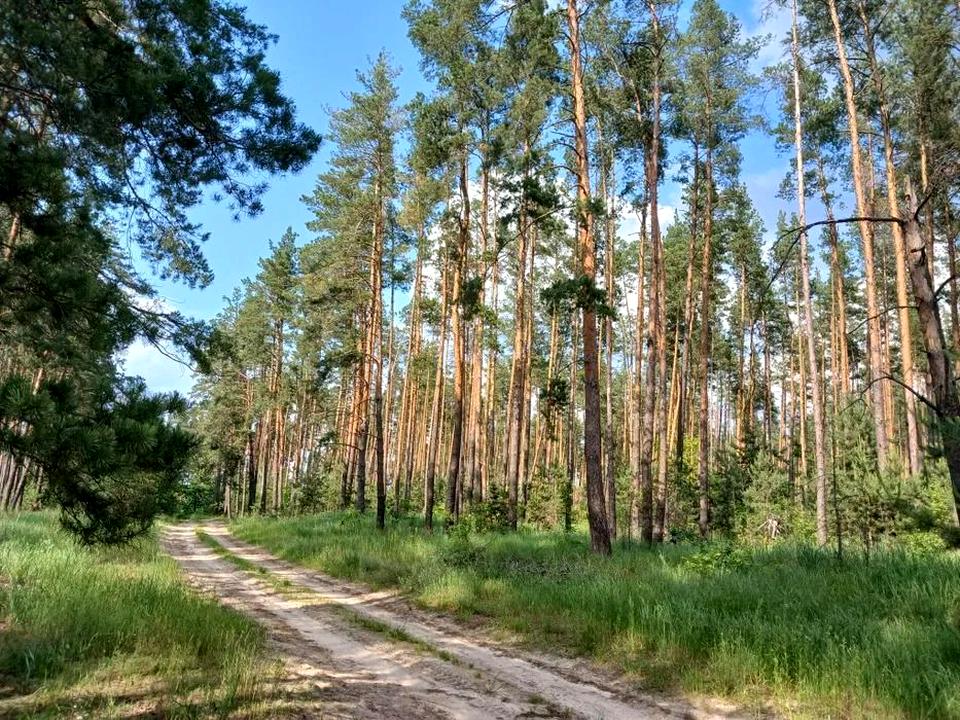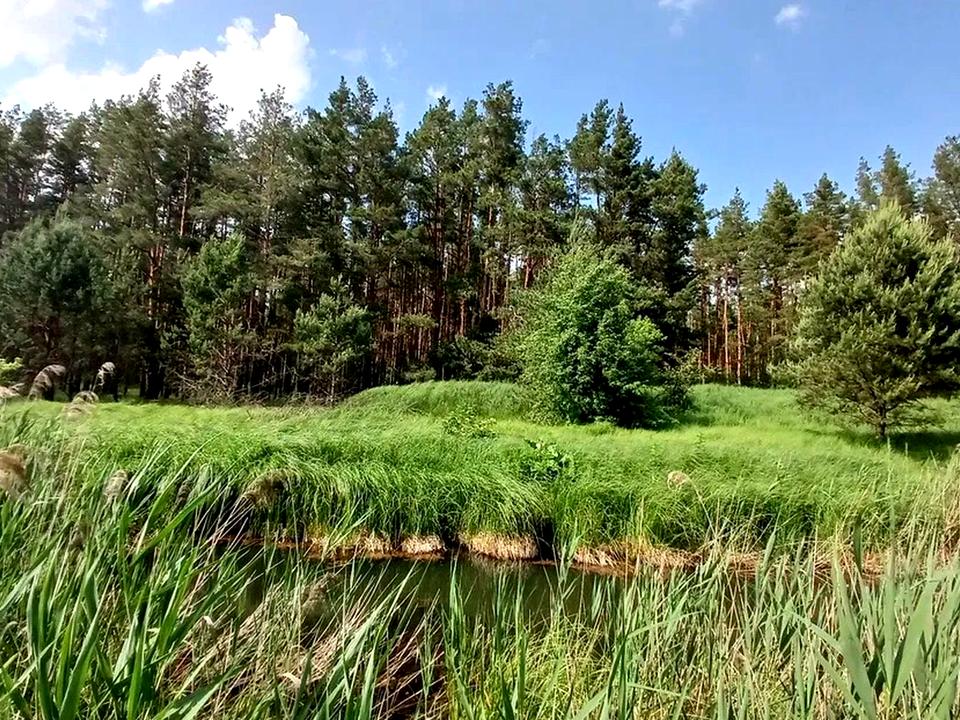 На ділянці ростуть молоді сосни, берези, є невеличке природне озеро.