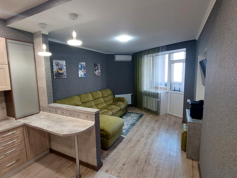 Вітальня поєднана із кухнею з виходом на балкон, вікна у двір будинку.