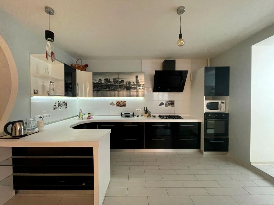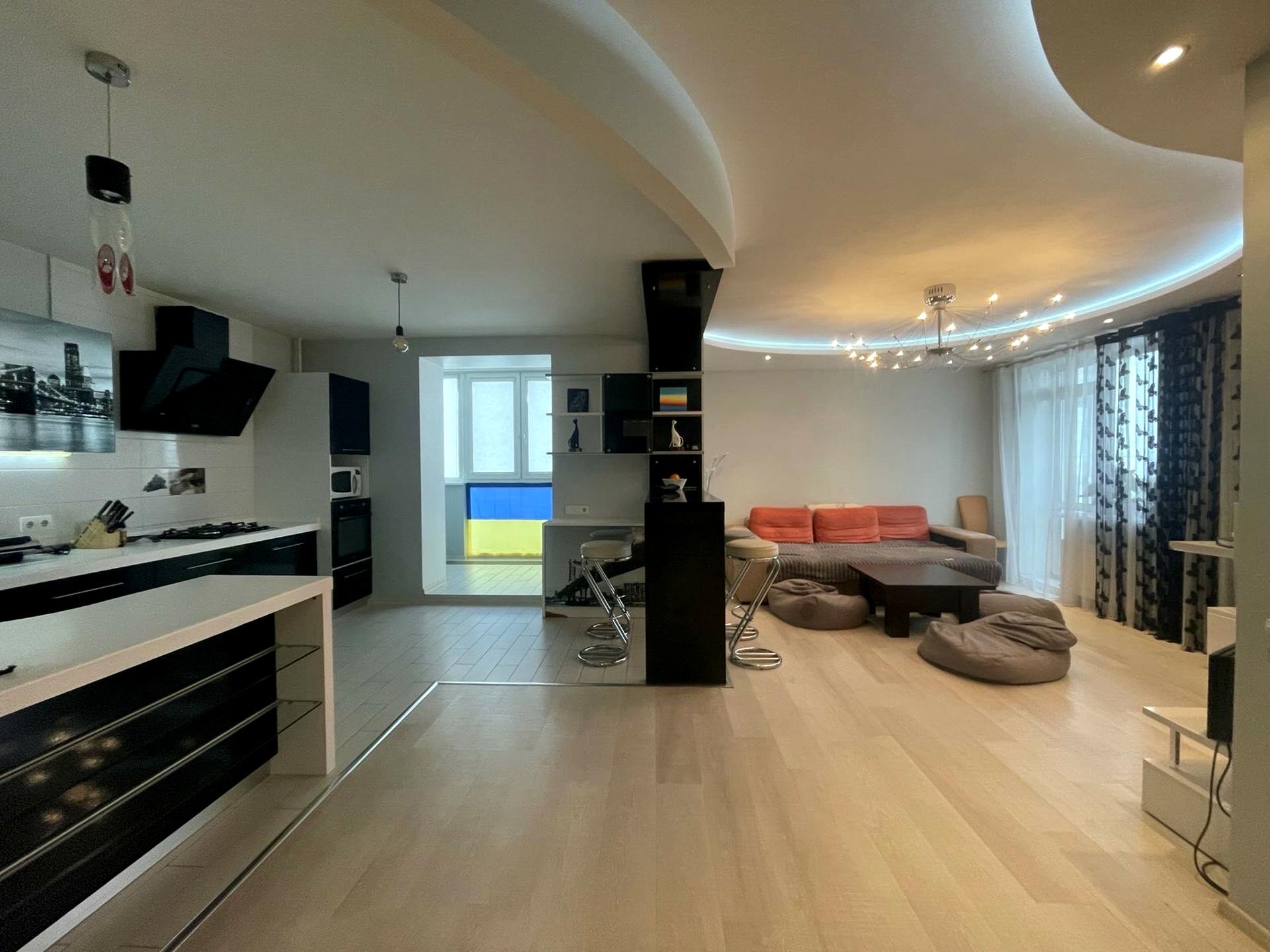 Простора великогабаритна утеплена чотирьохкімнатна квартира складається з кухні –гостинної площею 40 метрів, трьох житлових кімнат площею 12-13 метрів кожна, коридору, двох санвузлів, гардеробної, лоджії та двох балконів.