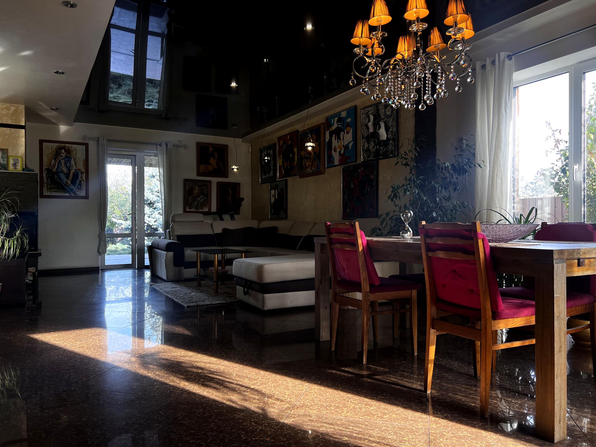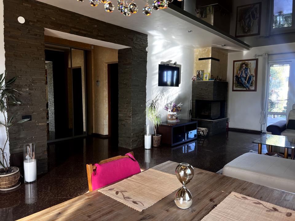 • Просторная гостиная с дровяным камином, создающим уют и тепло. Есть выход на террасу.