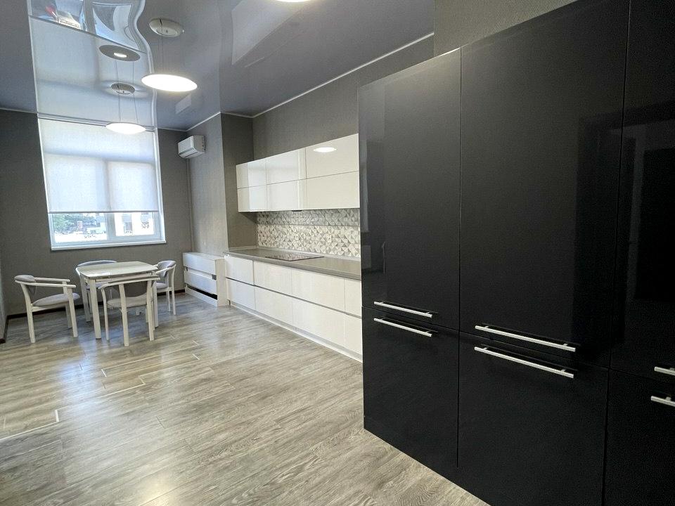 Формат: велика кухня-вітальня з виходом на засклений балкон, окремо спальня, санвузел з ванною, передпокій з гардеробною