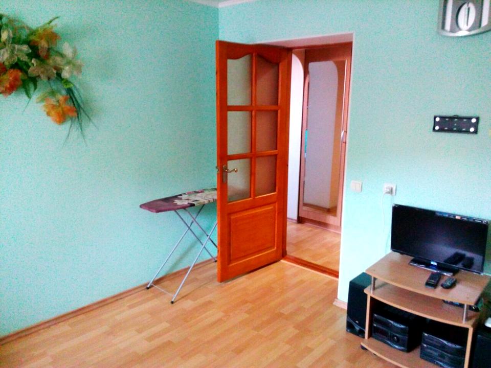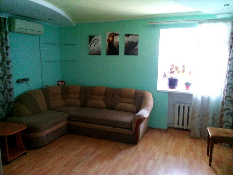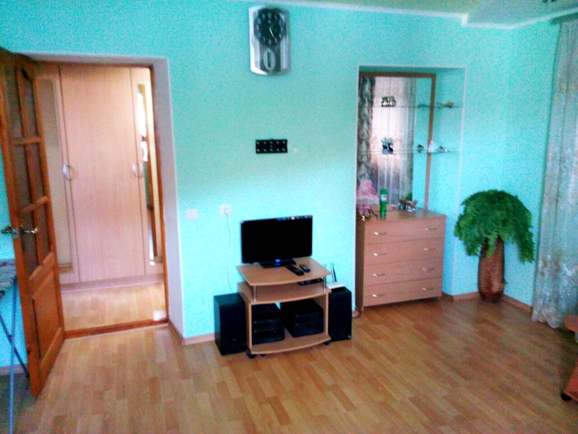 В комнате: большой раскладной двуспальный мягкий диван, напротив телевизор и музыкальный центр с мощными колонками, приятный цветовой интерьер и хорошая инсоляция в комнате.