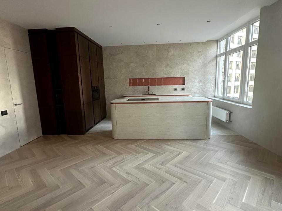 Выполнен дорогой ремонт, квартира полностью обесшумлена, на полу паркетная доска, двери скрытого монтажа .