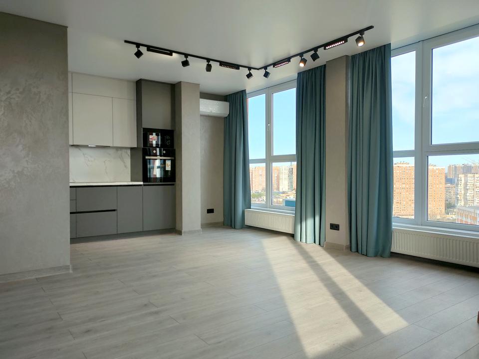 Выполнен современный ремонт, большая кухня гостиная с двумя панорамными окнами и красивым видом на город и уютная комната.