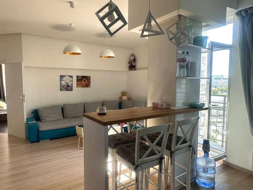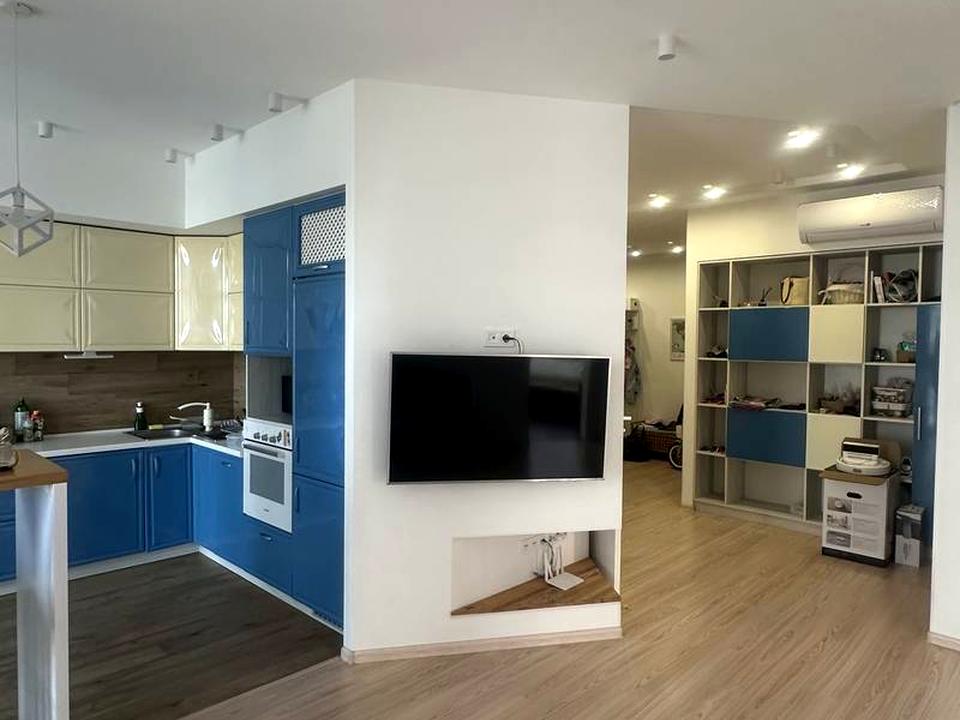 Просторная и светлая квартира с дизайнерским ремонтом, распланирована в большую уютную кухню-студию, две отдельные комнаты.