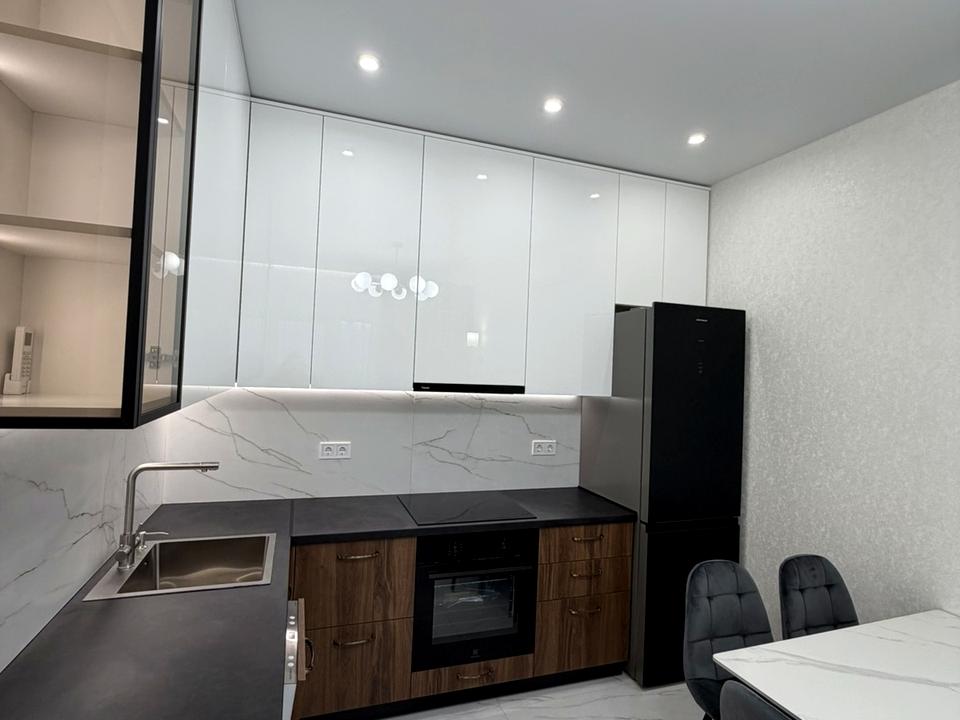кухня-гостиная: встроенная кухня, варочная поверхность, духовка, посудомойка, большой холодильник, стол с каменной столешницей, стулья, диван разлагается. Из кухни студии выход на балкон. По документам переуступки, звоните оперативный показ.