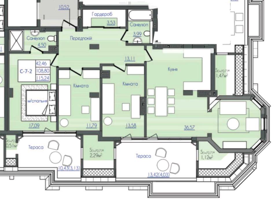 Планировка: три спальни (одна мастер-спальня), кухня-студия 36 м2, санузел, гардеробная, прихожая, много мест для хранения, две террасы.