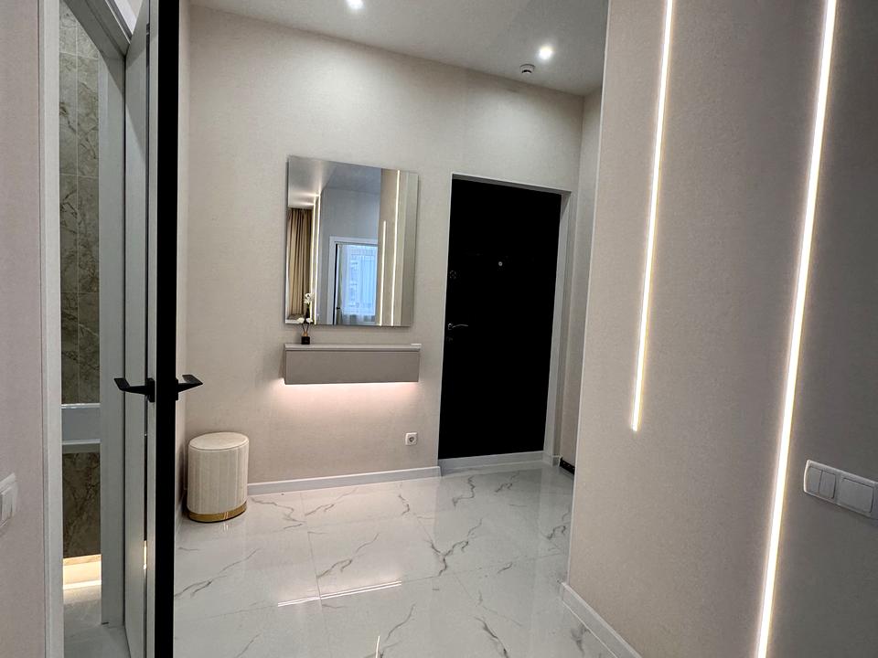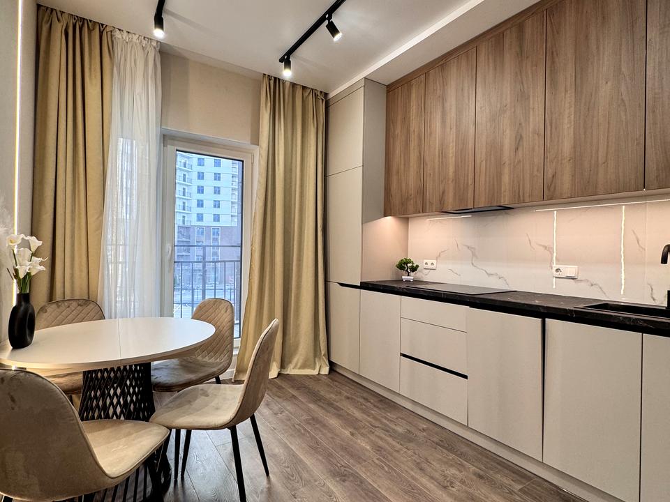 В квартирі 1 кімната, висота стелі 2.8 метра, Тип будинку - Спец. проект. Немає газу, кухонна плита електрична. Є балкон. У квартирі є Телевізор, Підігрів підлоги, Кондиціонер, Пральна машина, Сушильна машина, Ванна, Холодильник, Посудомийна машина. Будинок побудований в 2024 році. Загальний стан квартири - З ремонтом. Гаряча вода - централізована. Кількість санвузлів: 1. Інтернет оптоволоконний. Працює без світла - вода, опалення, ліфт. Тип кухні - кухня-студія. Кількість спален: 1. Комісія за послуги 5 %