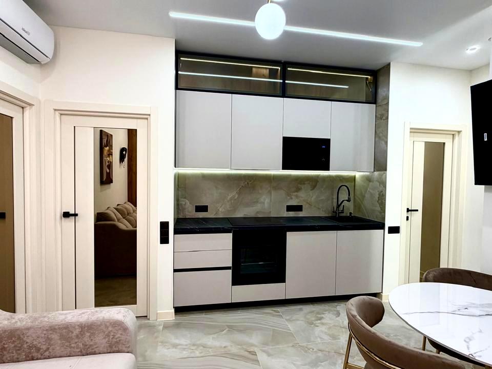 В квартирі 2 кімнати, Тип будинку - Спец. проект. Немає газу, кухонна плита електрична. У квартирі є Телевізор, Кабельне ТБ, Кондиціонер, Пральна машина, Душова кабіна, Холодильник, Посудомийна машина. Будинок побудований в 2024 році. Загальний стан квартири - З ремонтом. Безбар'єрність: пандус, дверні отвори в будинку шириною понад 0.9 м, ліфт, пристосований до крісла колісного. Гаряча вода - централізована. Кількість санвузлів: 1. Працює без світла - вода, опалення, інтернет, ліфт. Тип кухні - кухня-студія. Кількість спален: 2. Комісія за послуги 5 %