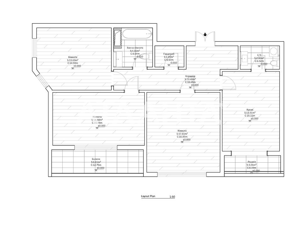 Функціональне планування: три просторі окремі кімнати, одна з яких із французьким балконом, велика кухня-їдальня, два санвузли, гардеробна, балкон і лоджія.