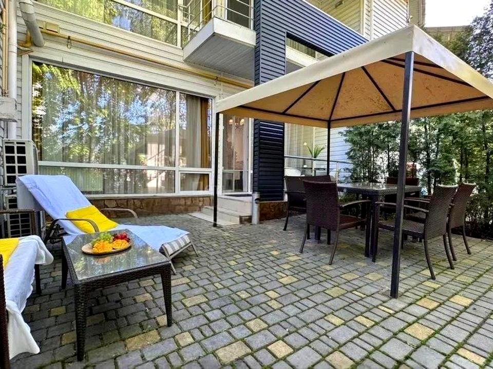 На первом этаже кухня-студия 40м2 с плазменной панелью, большой угловой раскладывающийся диван, веранда с летней мебелью, с/у с душ кабинкой.