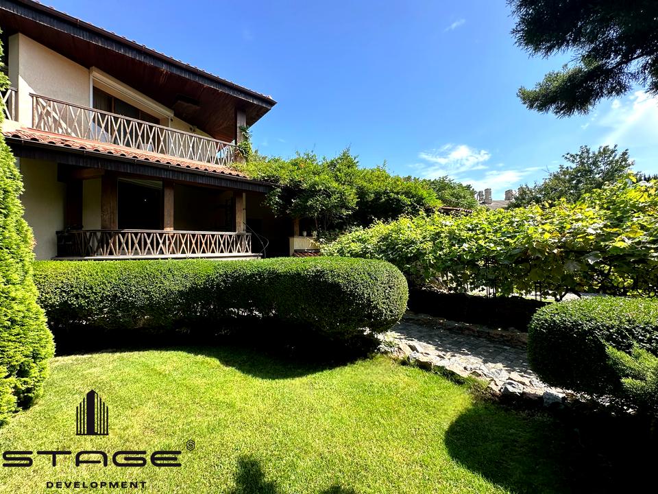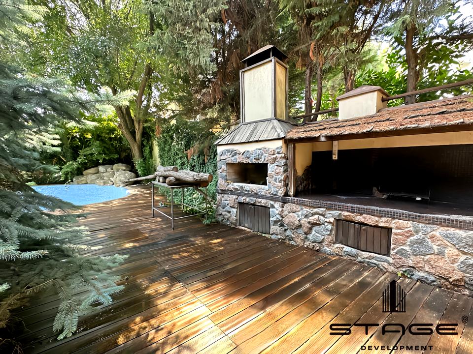 Очень зелёный участок - 9.5 соток. Есть зона барбекю, беседка, бассейн, гостевой домик или домик для прислуги. Перед домом есть будка для охраны, шлагбаум, место для парковки дополнительных машин.