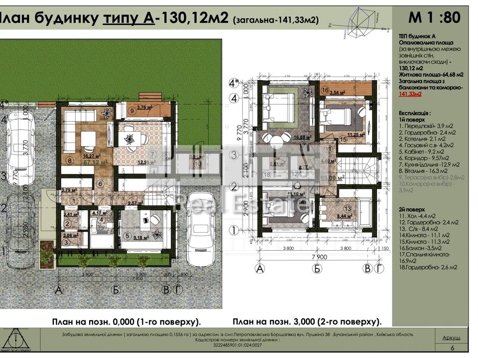 Площа: 141/65/29 м2, 2 поверхи, 4 кімнати + 2 паркомісця та 3 сотки