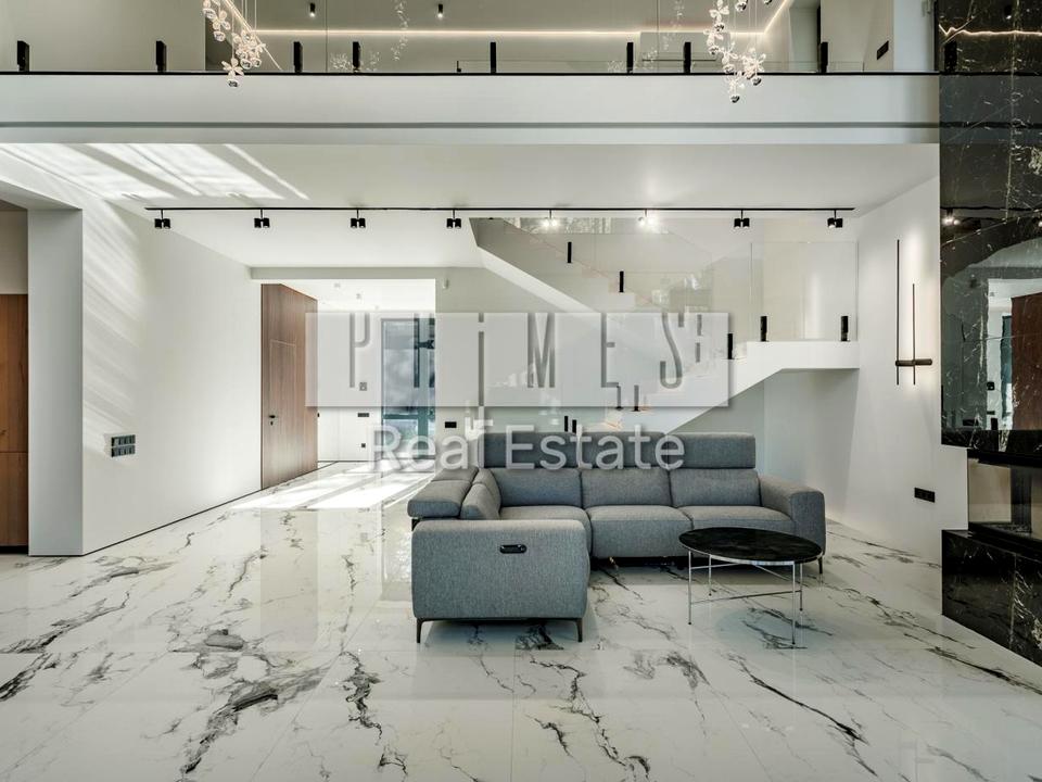 Інтер'єр будинку продуманий до дрібниць: просторі світлі кімнати з панорамними вікнами, лаконічні лінії та природні матеріали створюють відчуття простору та гармонії з природою. Високі стелі, відкриті планування та вбудовані системи «розумного будинку» підкреслюють сучасний характер житла.