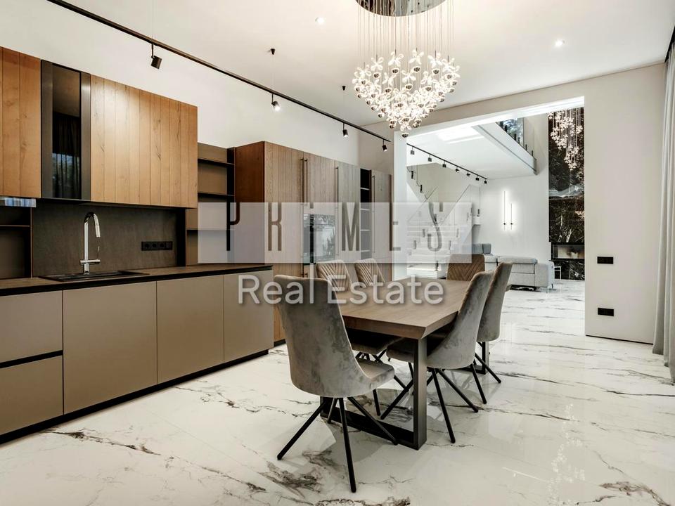 виконаний у стилі модерн, який гармонійно поєднує сучасні технології та витончену естетику. Розташований на просторій ділянці 18 соток, будинок оточений високими соснами, що створюють атмосферу затишку та усамітнення.