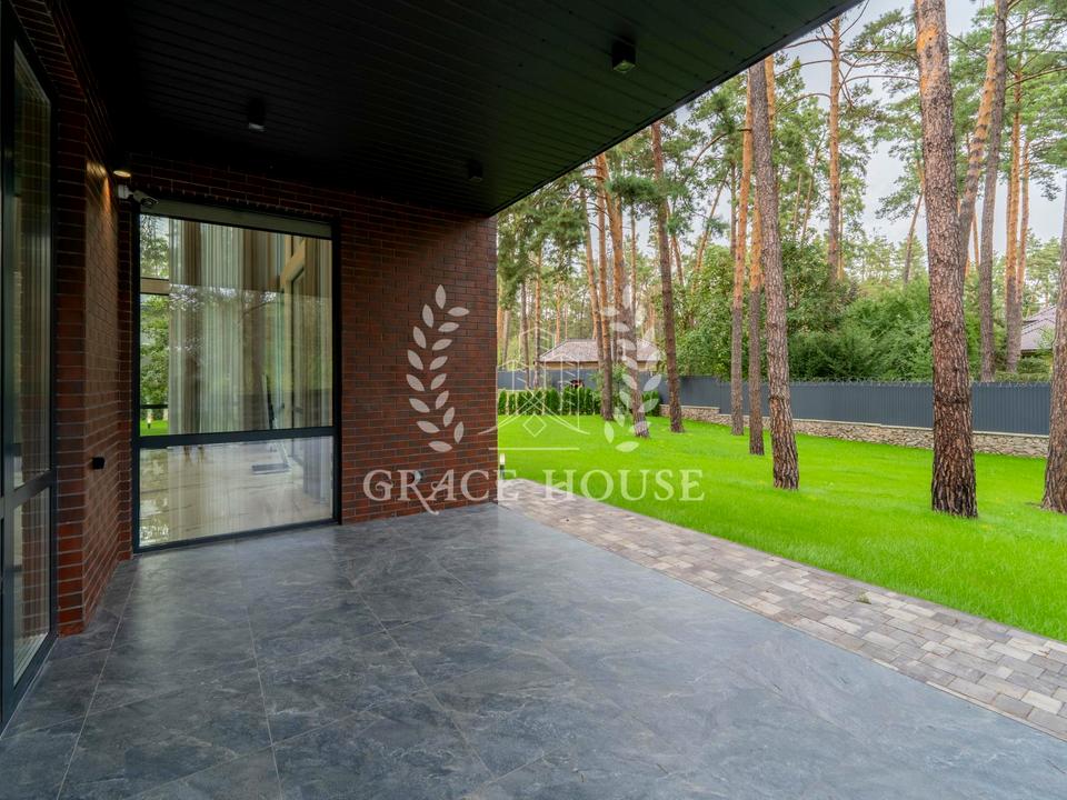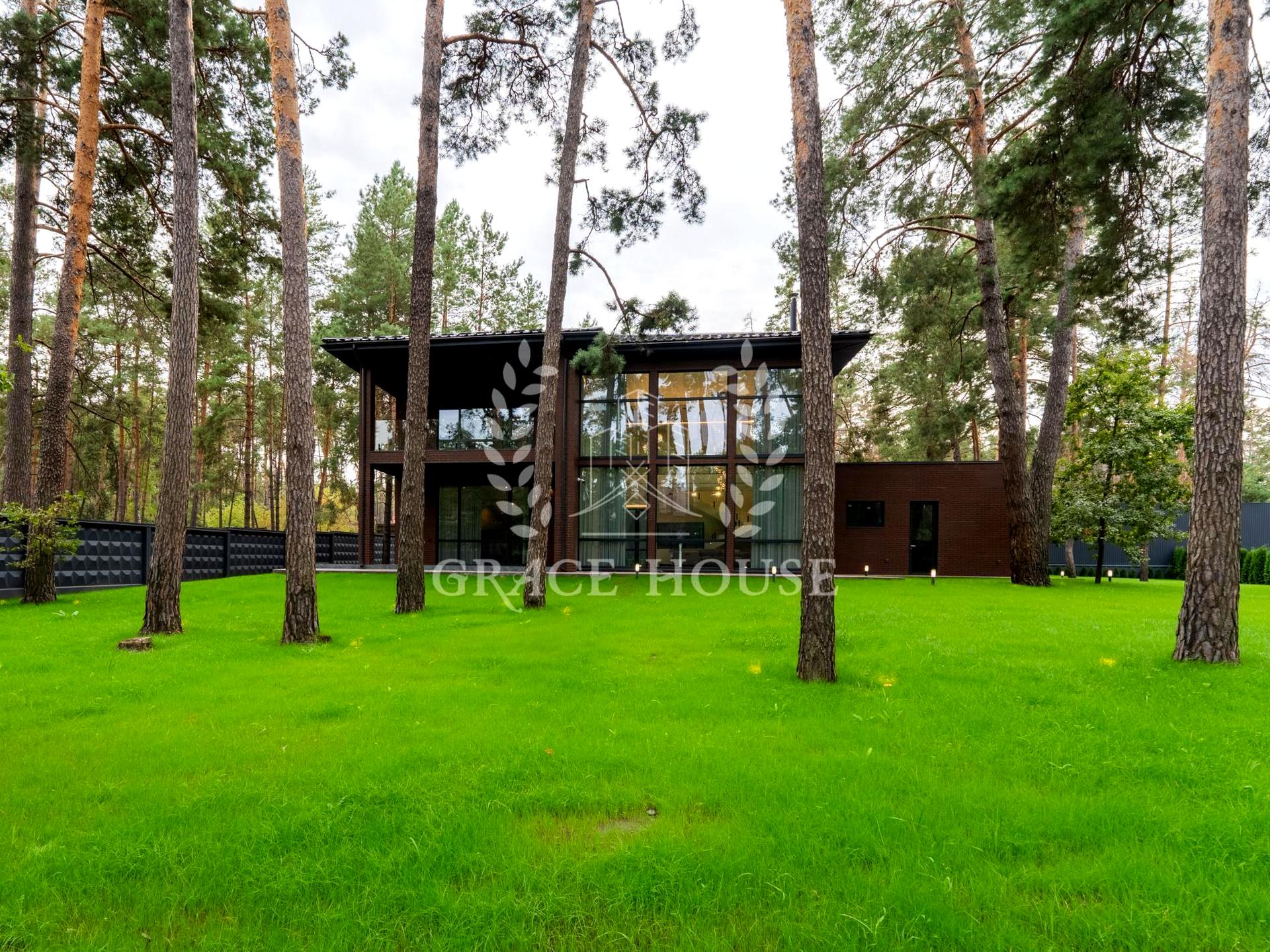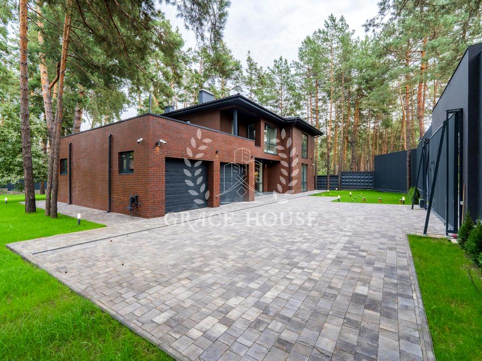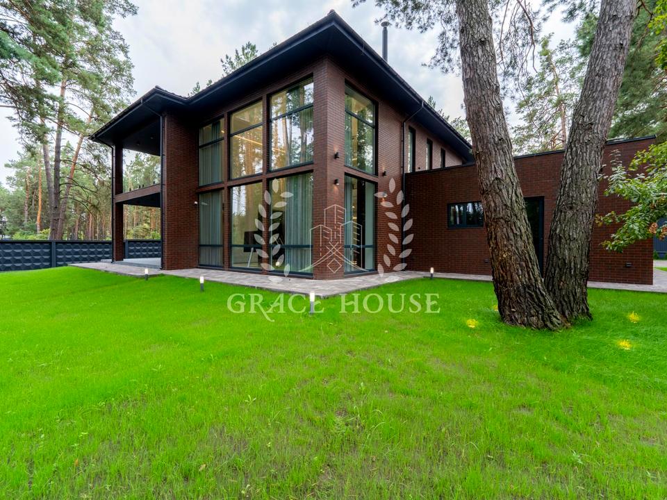 Ексклюзивний дизайнерський будинок в оточенні багаторічних сосен. До вашої уваги пропонується будинок нової будівлі в п. Плюти, Обухівський р-н. Площа будинку 350 кв. із земельною ділянкою 18 соток