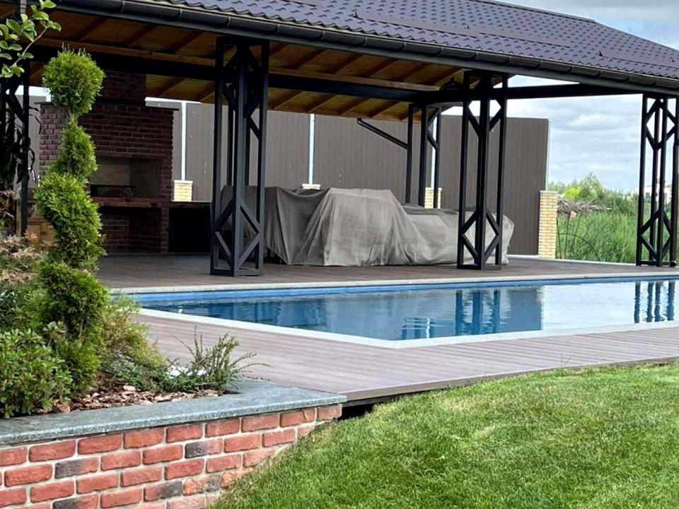 Вся мебель и отделка выполнены из натуральных материалов: дерево, мрамор, кожа. Большая терраса оборудована мангалом и мойкой. Дом оснащен геотермальным тепловым насосом с функциями отопления и охлаждения, что значительно снижает расходы зимой.